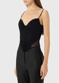 top satin bustier with shaped cups, boning, and trim profiles double-layered in stretch tulle with gathered pattern. - Double-layered satin in stretch tulle - Shaped cups - Boning - Trim profiles - Sleeveless - Straps - Gathered pattern tulle - Back zip closure - Body-hugging fit - Made in Italy DETAILS To find the correct size for you, please consult the Size Guide. Composition: Main fabric: 90% polyamide, 10% elastane; Main lining: 75% polyamide, 25% elastane; Fabric 2: 71% polyamide, 29% elastane; Trimmings: 80% polyamide, 20% elastane Wash very delicate cycle max 30°C; Do not bleach; Do not tumble dry; Do not iron; Dry clean with tetrachloroethylene or hydrocarbons - gentle cycle; Reshape after wash; Remove detachable trims before washing; Wash inside out; Gentle spin; Wash in a mesh bag