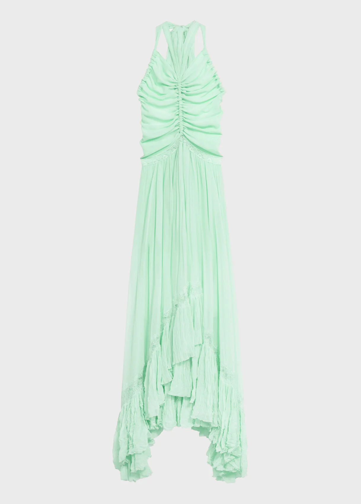 This long viscose crepe georgette dress features a halterneck, a gathered bodice, lace inserts, an asymmetrical skirt with a flounced hem, and a sash belt that ties to a bow on the back. - Viscose crepe georgette - Halter neckline - Off-the-shoulder cut - Sleeveless - Bodice with gathered detailing - Lace inserts - Asymmetrical skirt with flounce - Sash belt that ties to a bow on the back - Deep neckline on the back - Zip closure - Floor length - Regular fit - Made in Italy DETAILS Composition: External fabric: 100% Viscose; Main lining: 100% Polyester; Lace: 100% Polyamide Do not wash; Do not bleach; Do not tumble dry; Do not iron; Dry clean with tetrachloroethylene or hydrocarbons - gentle cycle; Clean inside out; Clean in mesh bag