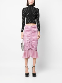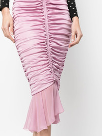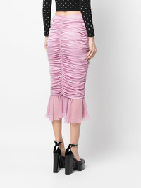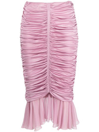 ruched silk midi skirt orchid purple silk blend ruched detailing draped detailing semi-sheer overlay mid-rise calf-length bodycon design Made in Italy Composition Outer: Silk 100%, Viscose 100% Lining: Polyamide 73%, Elastane 27% SIZE & FIT Model measurements Height 5 ft 10 in(1.78 m) Bust/Chest 33.46 in(85 cm) Hips 36.22 in(92 cm) Waist 23.22 in(59 cm) FittingInformation This piece fits true to size. We recommend you get your regular size Cut for a close fit Made with a mid-weight fabric Washing instructions Dry Clean Only