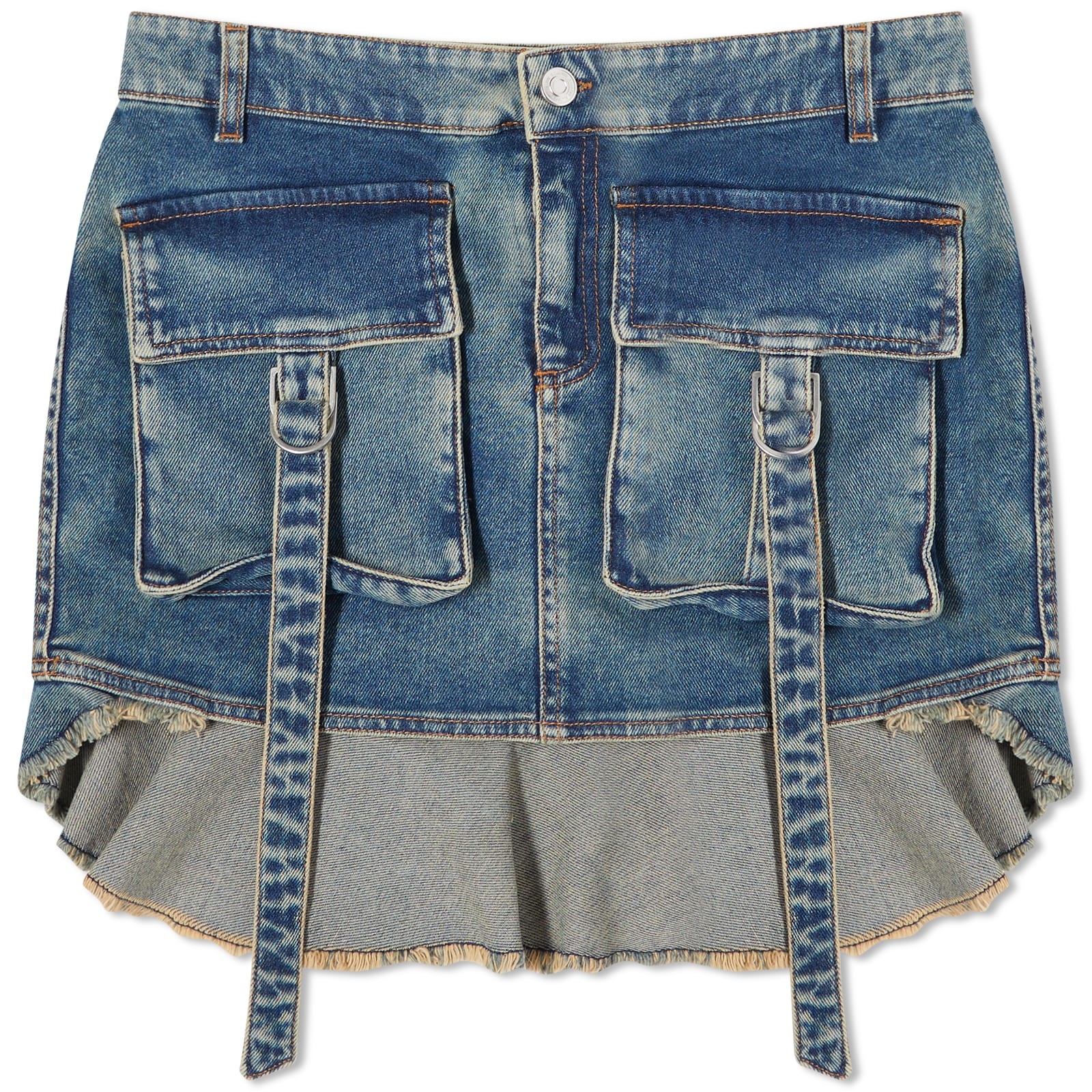 Ride the wave of noughties nostalgia with the Blumarine Denim Cargo Mini Skirt. Long slung? Check. Utility cargo pockets? Check. This skirt hits all the era’s design codes and channels the revival with a stretchy faded wash denim and floaty frayed flounce hem. - 98% Cotton, 2% Elastane - Low Rise - Zip Fly & Button Closure - Front Buckle Cargo Pockets - Asymmetric Fringed Hem - Machine Wash 30°C