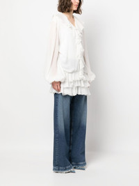 fil coupe ruffled blouse Highlights - White - Silk blend - Ruffled detailing - Semi-sheer construction - V-neck - Long puff sleeves - Tiered hem Made in Italy Composition Outer: Silk 92%, Polyamide 8% Lining: Polyester 100% SIZE & FIT Model measurements Height 5 ft 10 in(1.79 m) Bust/Chest 32.67 in(83 cm) Hips 34.25 in(87 cm) Waist 24.4 in(62 cm) FittingInformation This piece fits true to size. We recommend you get your regular size Cut for a loose fit Made with a mid-weight non-stretch fabric Washing instructions Dry Clean Only