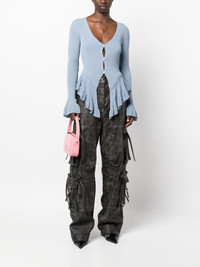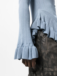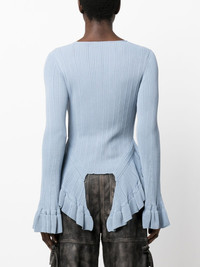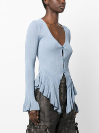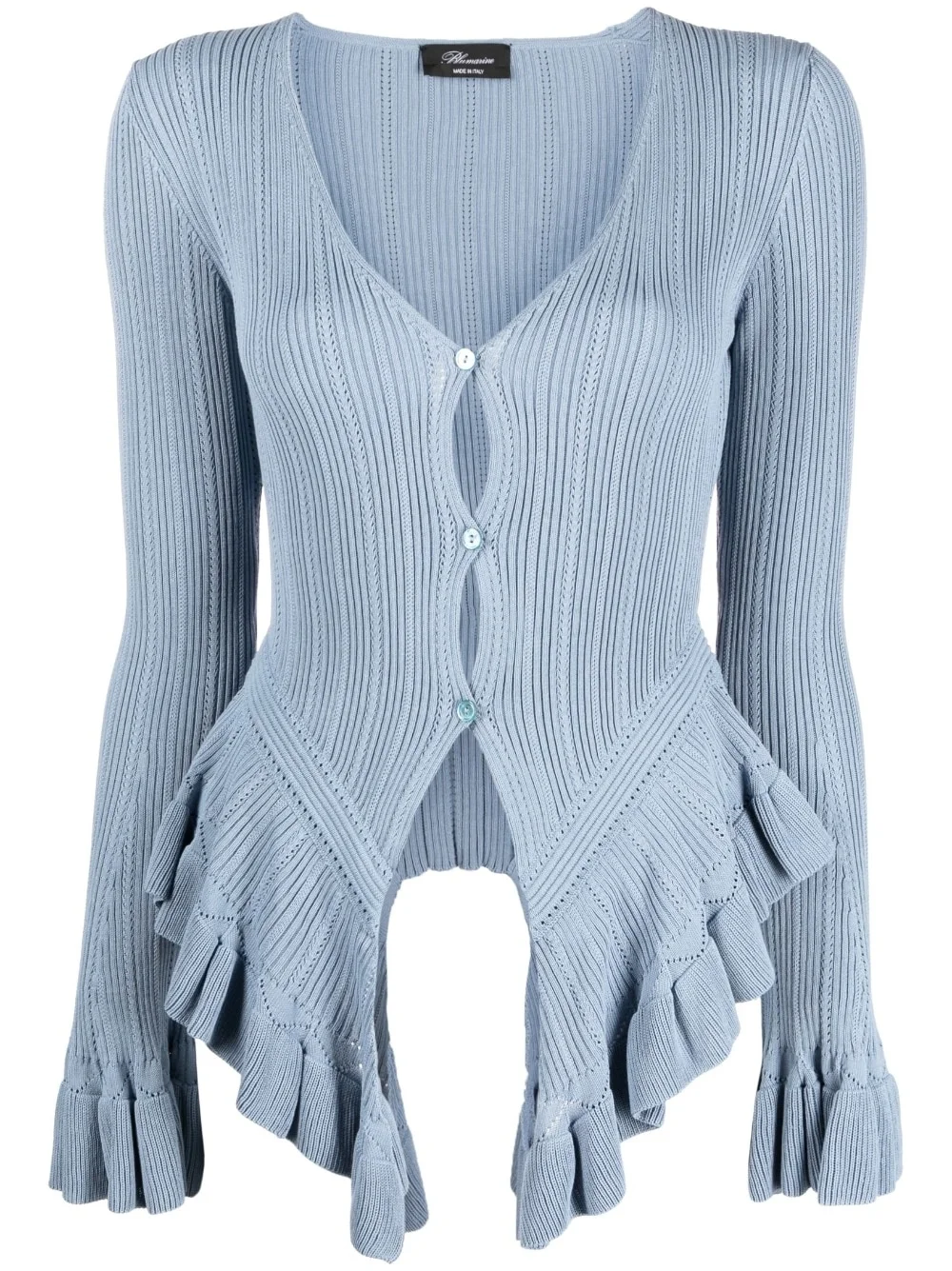 ruffled-hem knit cardigan Highlights - Light blue - Cotton - Ruffled hem - V-neck - Front button fastening - Long sleeves Made in Italy Composition Viscose 70%, Cotton 30% SIZE & FIT Model measurements Height 5 ft 10 in(1.77 m) Bust/Chest 32.28 in(82 cm) Hips 35.03 in(89 cm) Waist 25.19 in(64 cm) FittingInformation Designed for a slim fit that sits just away from the body offering a close yet comfortable fit Made with a midweight knit, this piece offers some stretch This piece fits true to size – take your usual size Washing instructions Hand Wash