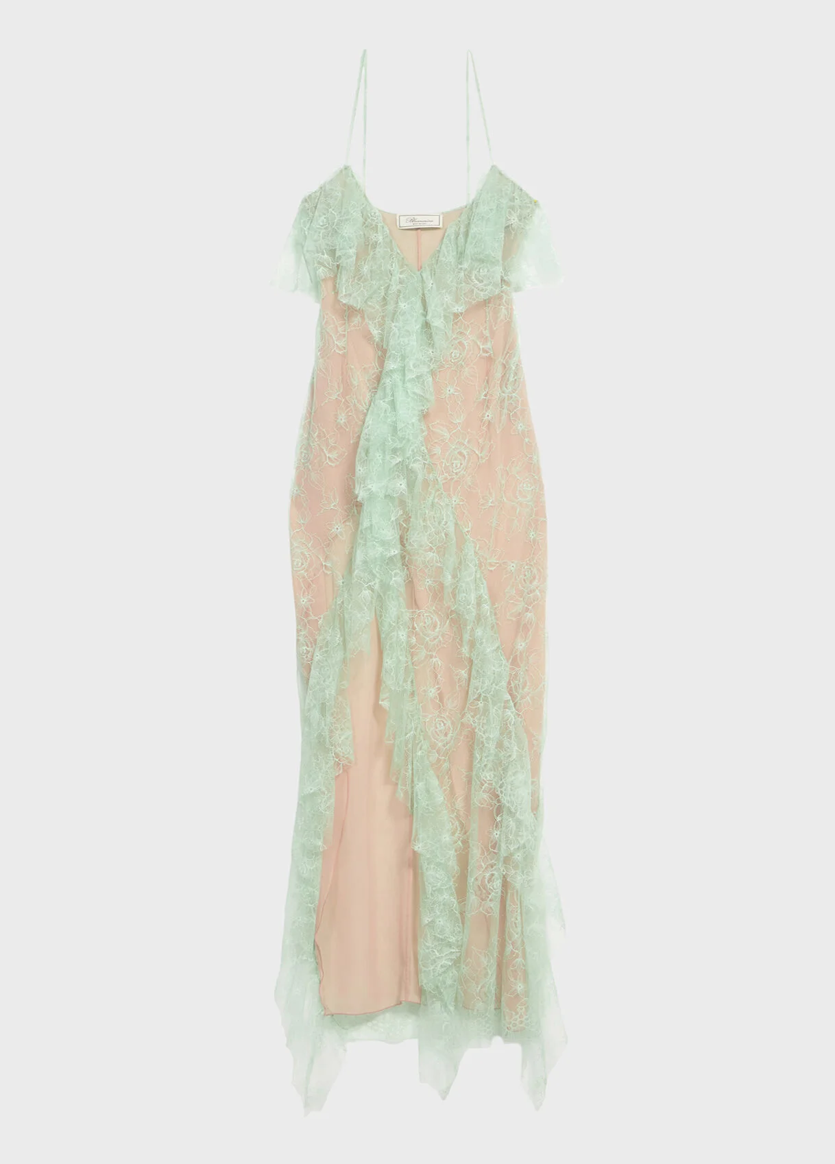 Long see-through Chantilly lace dress with a V-neck and deep slit trimmed with a gathered flounce. - See-through Chantilly lace - Sleeveless - Shoulder straps - V-neck and a slit on one leg trimmed with gathered flounces - Low neckline on the back - Lined - Floor length - Regular fit - Made in Italy DETAILS Composition: External fabric: 100% Polyamide; Main lining: 100% Polyester Gentle wash at max 30°C; Do not bleach; Do not tumble dry; Iron at low temperature - without steam; Dry clean with tetrachloroethylene or hydrocarbons - gentle cycle; Wash inside out; Gentle spin cycle; Wash in a mesh bag; Iron inside out