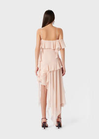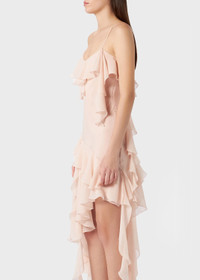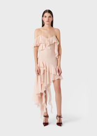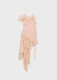 A GEORGETTE SILK DRESS WITH RUFFLES, SPAGHETTI STRAPS, AND A CAP SLEEVE WITH AN OFF-SHOULDER DETAIL. ASYMMETRIC HEM WITH WAVES AND RUFFLES. COMPOSITION: 100% SE. - WASHED SILK GEORGETTE - RUFFLES - STRAPS - ONE SHORT SLEEVE - BARE SHOULDER - STRAIGHT NECKLINE - ASYMMETRIC WAVY BOTTOM - DANGLING SASHES - FULLY LINED - REGULAR FIT DETAILS COLORS: PINK