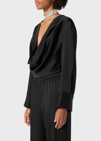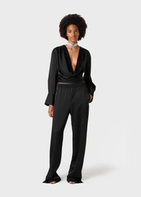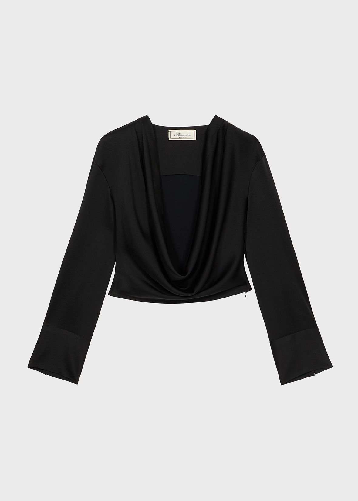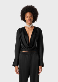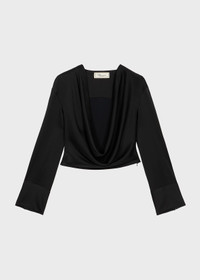 A SOFT DRAPED NECKLINE DEFINES THIS CROPPED SATIN BLOUSE WITH LONG SLEEVES AND BUTTONED CUFFS. COMPOSITION: 71% ACETATE 27% VISCOSE 2% ELASTANE - SATIN - DRAPED NECKLINE - LONG SLEEVES - WIDE CUFFS WITH BUTTONS - ZIP CLOSURE AT SIDE - REGULAR FIT DETAILS COLORS: BLACK