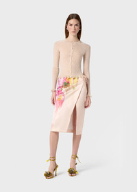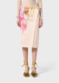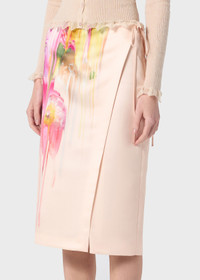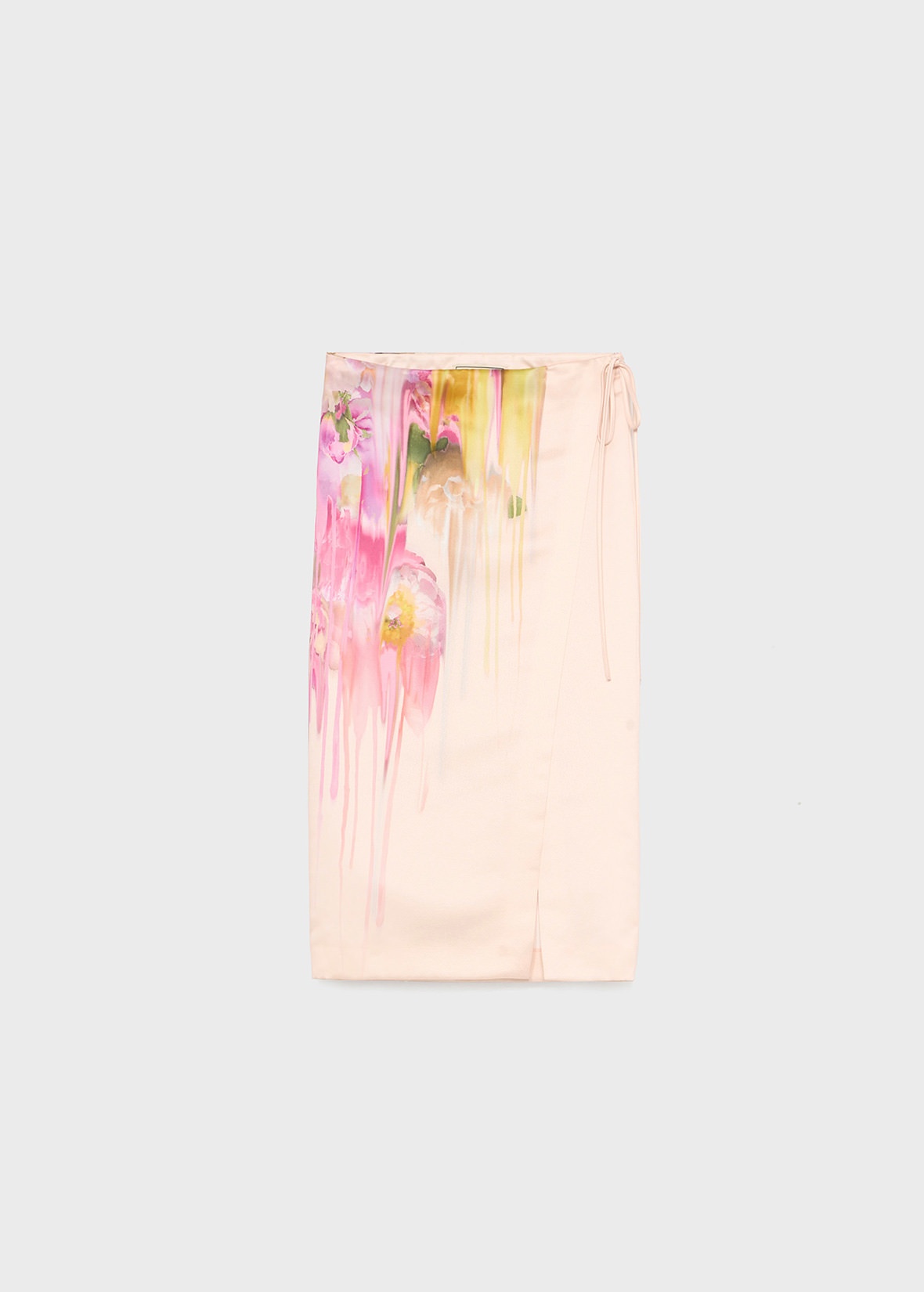 LIQUID FLOWERS PRINT DUCHESSE MIDI SKIRT WITH AN ASYMMETRIC CUT CREATING A SIDE SLIT COMPOSITION: 100%PL - DUCHESSE - LIQUID FLOWER PRINT - ASYMMETRIC LINE - SIDE SLIT - WRAP-AROUND CLOSURE WITH MEDIUM-LENGTH TIE STRAPS - REGULAR FIT DETAILS COLORS: PINK
