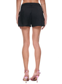 BLUMARINE shorts in black, satin construction, mid-waist, belt loops, button zip fastening, bellows zip pockets, invisible hook & zip, mini length, relaxed fit. Made in Italy Italian Sizing 71% Acrylic, 27% Viscose, 2% Elastane Model is 5'9" wearing size 38. Bust: 33" Waist: 24" Hip: 33"