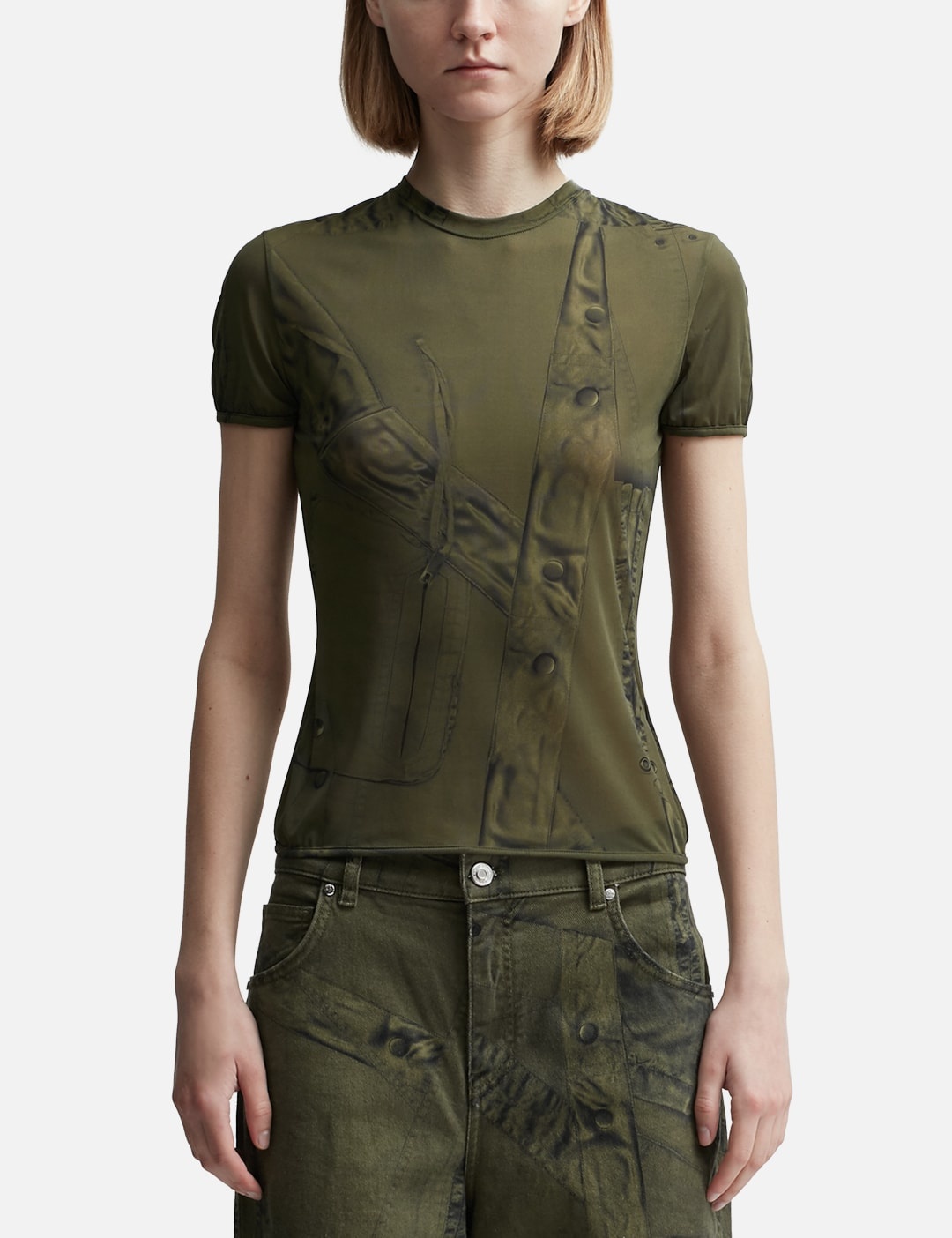 - Blumarine - Printed T-shirt - Lightweight stretch nylon fabric - Semi sheer finish - Reinforced trims - Color: Military Green - Country Of Origin: IT - Material: 90% Nylon, 10% Elastane - See more SS T-Shirts, T-Shirts and Clothing SIZING - Model wears size 38 - Model measures: Height 179cm, Chest 32”/81cm, Waist 23’’/58.42cm, Hip 35’’/88.9cm