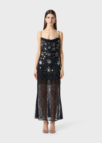 Long lace dress with hand-embroidered iridescent sequins and metal studs on the bodice, straight neckline, and see-through skirt. - Rebrode lace - Hand embroidery of iridescent sequins and metal studs - Straight neckline - Sleeveless cut - Shoulder pads - Coupled top - Sheer full skirt - Low-cut back - Zip closure at back - Ankle-length cut - Regular fit DETAILS To find the correct size for you, please consult the Size Guide. Composition: Main fabric: 100% polyamide; Main lining: 100% polyester; Embroidery: 50% polyvinyl chloride (PVC), 40% brass, 10% glass Do not wash; Do not bleach; Do not tumble dry; Iron at low temperature - no steam; Dry clean with hydrocarbons - gentle cycle; Wash separately; Wash inside out; Wash in a mesh bag; Iron inside out; Do not iron trims; Iron by interposing a cloth