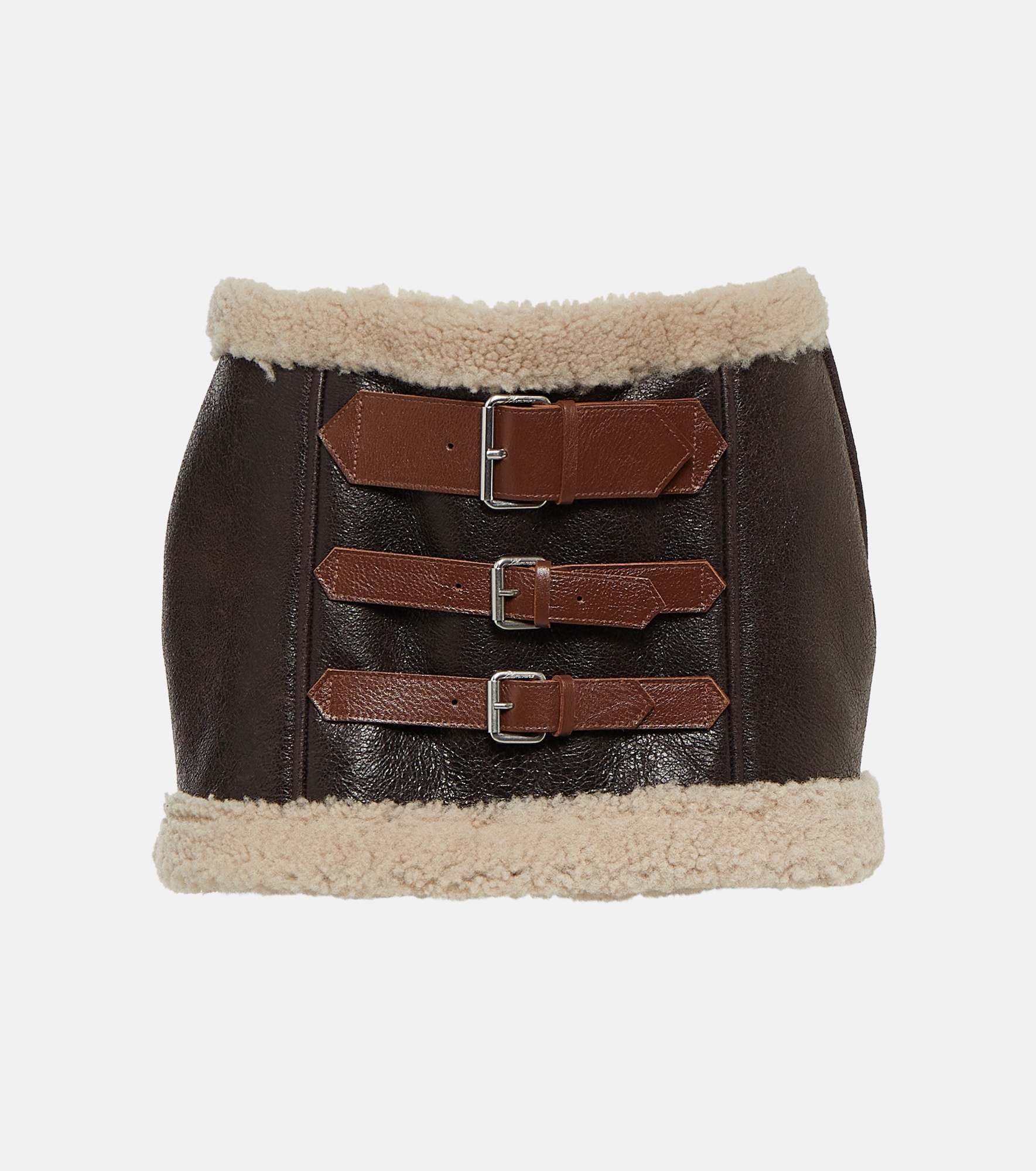 Blumarine captures the opulence of the '00s, contemporizing the Y2K aesthetic for a modern audience. Made from glossy leather, this miniskirt is accented with tactile shearling trims and buckle embellishments. Product Details - Material: 100% leather - Care instructions: do not wash - Made in Italy - Designer color name: T.Di Moro/Camoscio - Contains non-textile parts of animal origin - Closure: zipped side - Insert: 100% leather - Item number: P00853401 Size & Fit - True to size - Mid-weight material - Thick material - Sits low on the hips - The model seen in the picture is 178cm-5'10" and wearing a size IT 40