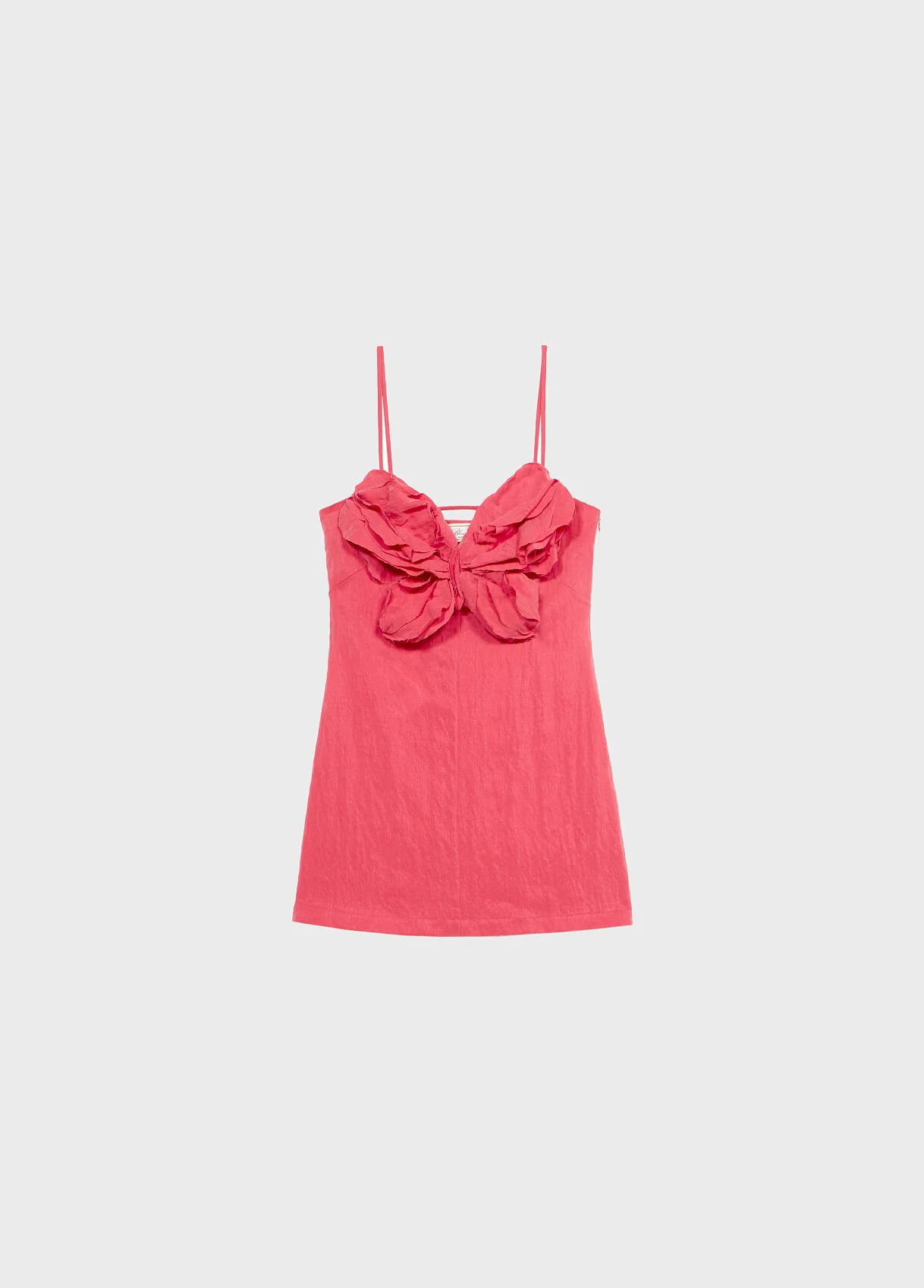 Short dress with a straight silhouette in washed gabardine, featuring a raw-edge 3D fabric butterfly. - Washed viscose gabardine - Raw-edge 3D fabric butterfly - Pencil silhouette - Sleeveless - Straps - Straight neckline - Back neckline - Covered back slit - Side zip closure - Mini length - Regular fit DETAILS To find the correct size for you, please consult the Size Guide. Composition: Main fabric: 94% Viscose, 6% Polyamide Do not wash; Do not bleach; Do not tumble dry; Iron at low temperature - without steam; Dry clean with tetrachloroethylene or hydrocarbons - gentle process; Wash inside out; Iron inside out