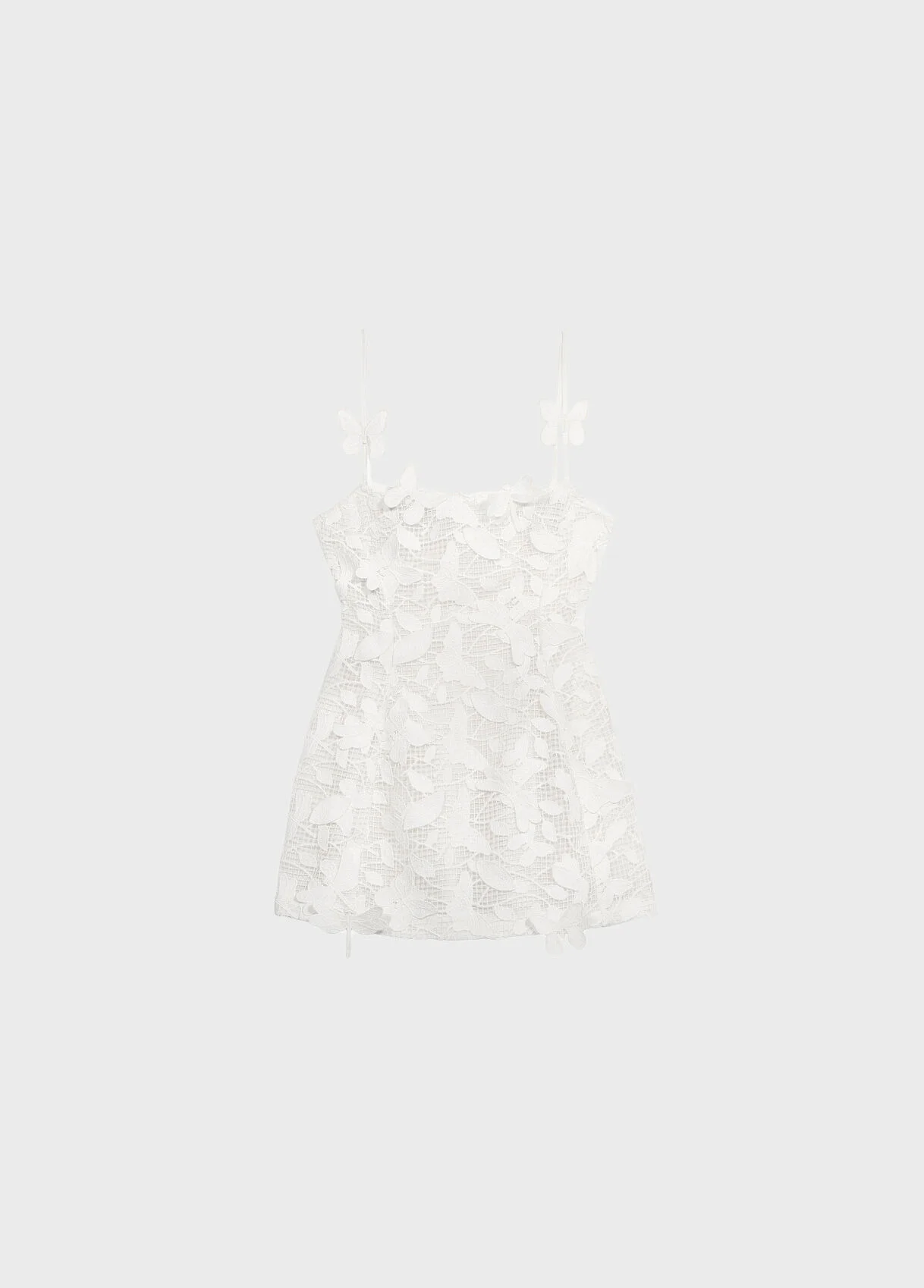 Short dress in 3D macrame lace on a mesh base with applied butterflies. - 3D macrame lace on mesh base - 3D applied butterflies - Sleeveless - Straps - Straight neckline - Wide skirt - Back neckline - Back zip closure with internal lining - Mini length - Regular fit DETAILS To find the correct size for you, please consult the Size Guide. Composition: Main fabric: 100% Polyester | Lining: 100% Polyester Gently wash at max 30°C; Do not bleach; Do not tumble dry; Iron at low temperature - without steam; Dry clean with tetrachloroethylene or hydrocarbons - gentle process; Wash inside out; Delicate spin cycle; Wash in a mesh bag; Iron inside out