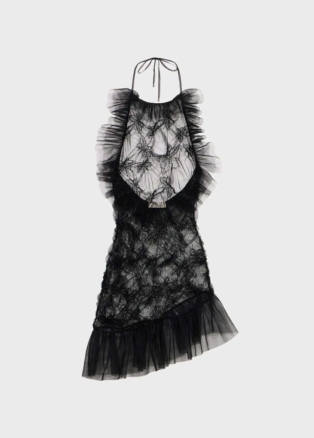 Short tulle dress with embossed butterfly embroidery, wide ruffles, and an asymmetrical hem. - Tulle - Embossed butterfly embroidery - Ruffle trim - Halter neckline - Sleeveless - Off-the-shoulder - Asymmetrical hem - Deep back neckline - Removable slip - Mini length - Bodycon fit DETAILS To find the correct size for you, please consult the Size Guide. Composition: Main fabric: 100% Polyamide | Slip: 75% Polyamide, 25% Elastane | Trimming: 80% Polyamide, 20% Elastane Do not wash; Do not bleach; Do not tumble dry; Do not iron; Dry clean with tetrachloroethylene or hydrocarbons - delicate process; Reshape after washing; Do not expose to direct heat sources; Wash inside out