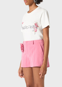 A HANDMADE 3D ROSE IS APPLIED TO THESE FLUID GABARDINE SHORTS WITH POCKETS. COMPOSITION: 50% COTTON 49% VISCOSE 1% ELASTANE - FLUID VISCOSE GABARDINE - HANDMADE 3D ROSE PIN - BELT LOOPS - CONCEALED HOOK AND ZIPPER CLOSURE - POCKETS AT THE HIPS - WELT POCKETS AT BACK - MINI LENGTH - REGULAR FIT DETAILS COLORS: PINK