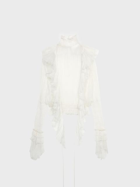 SILK CRINKLED CHIFFON BLOUSE WITH GATHERED DETAILS AT THE COLLAR, WRISTS, AND HEM, APPLIED RUFFLES AT THE FRONT, FLUTED CUFFS WITH TIES. COMPOSITION: 100%SE - CRINKLED SILK CHIFFON - GATHERED HONEYCOMB PATTERN AT THE HIGH COLLAR, WRISTS, AND HEM - APPLIED RUFFLES AT THE FRONT - LONG PUFF SLEEVES - FLUTED CUFFS WITH TIES - BACK CLOSURE WITH DROP AND BUTTONS - REGULAR FIT DETAILS COLORS: WHITE