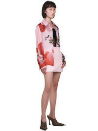 Bluemarine shirt in pink, spread collar, tonal front button closure, long sleeves with french cuffs and attached cuff links, all over floral print, rounded/finished hem, tonal stitching. Made in Italy. Italian sizing. Composition - 100% Silk. Model Measurements: Model is 5ft 8” and wearing a size 40. Bust: 32” Waist: 24” Hip: 34"