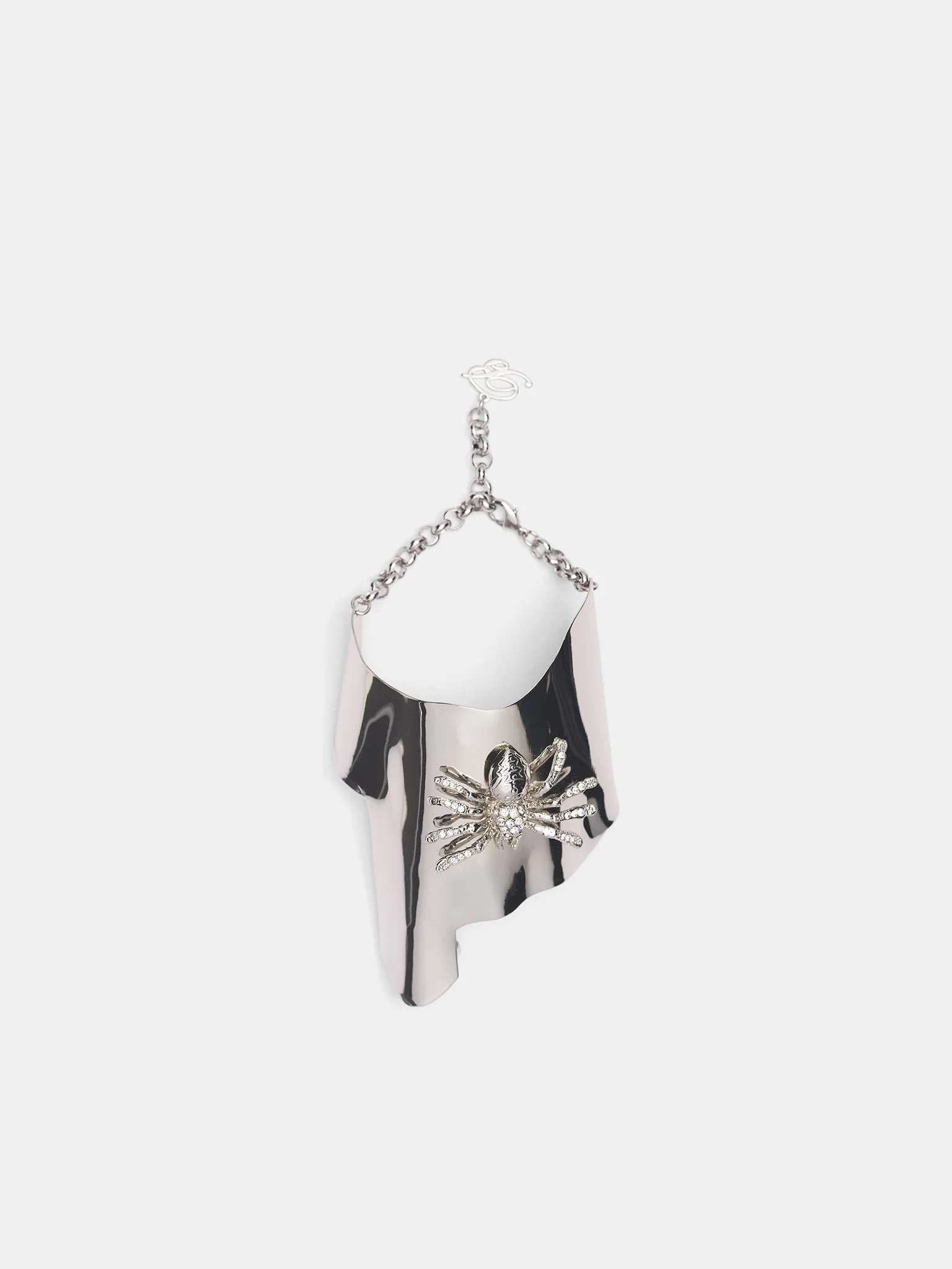 Hand cover in silver designed as a half-hand chain construction with raised spider embellishment and adjustable clasp fastening. Featuring: • Adjustable fit • Half hand cover design • Raised spider embellishment • Chainlink bracelet • Logo plaque • Lobster claw clasp fastening