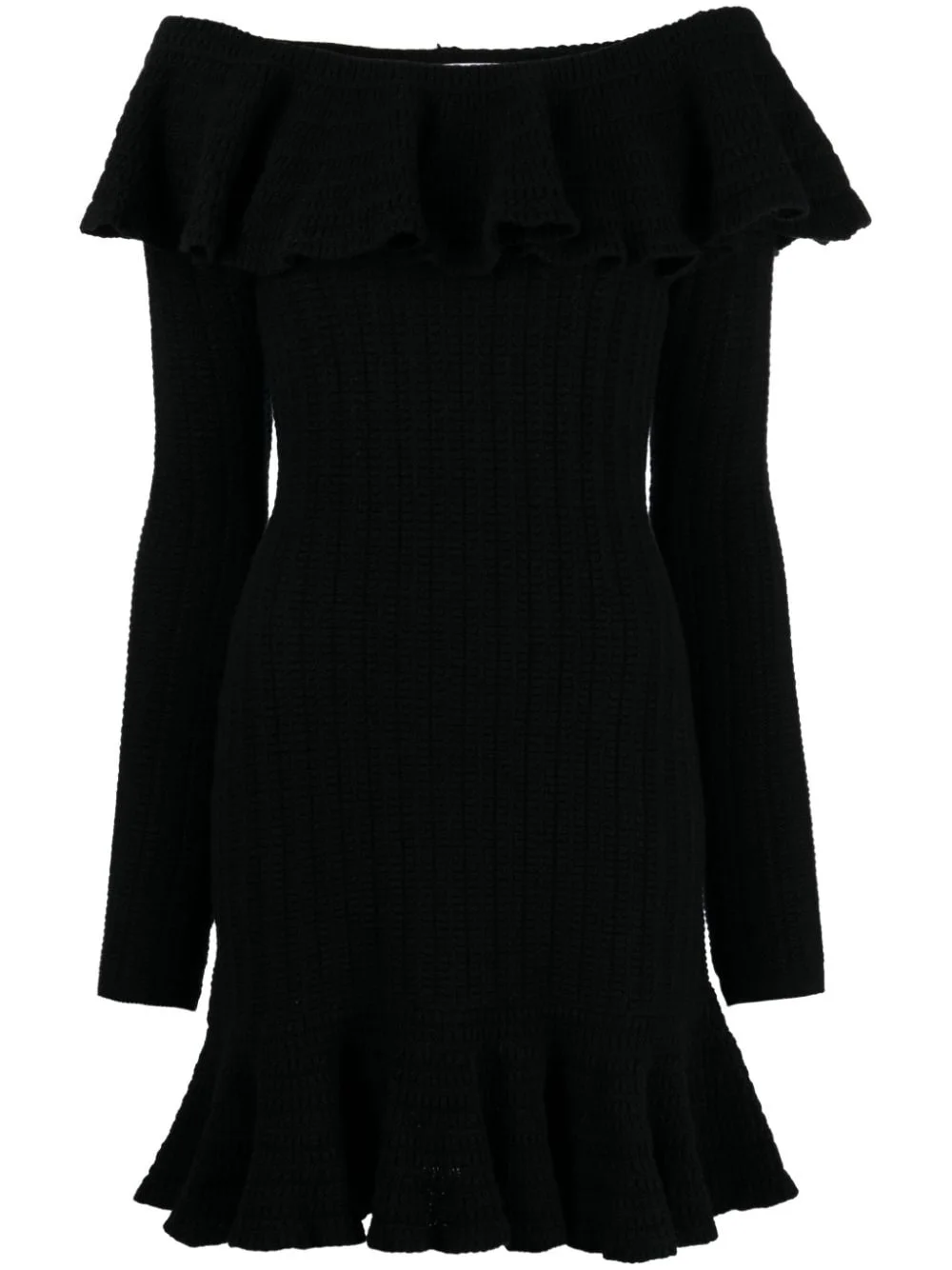 square-neck wool minidress Highlights - Black - Wool - Square neck - Long sleeves - Flared hem - Thigh-length Made in Italy Composition Wool 100% SIZE & FIT Model measurements Height 5 ft 10 in(1.77 m) Bust/Chest 31.49 in(80 cm) Hips 35.43 in(90 cm) Waist 25.19 in(64 cm) FittingInformation Designed for a slim fit that sits just away from the body offering a close yet comfortable fit Made with a midweight knit, this piece offers some stretch This piece fits true to size – take your usual size
