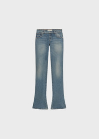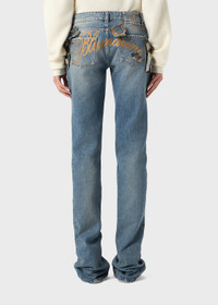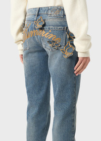 STRAIGHT LEG FIVE-POCKET JEANS WITH EMBROIDERED LOGO AND APPLIED FLOWERS ON THE BACK. COMPOSITION: 100% COTTON - MID-WASH DENIM - EMBROIDERED BLUMARINE LOGO ON THE BACK - EMBROIDERED FLOWERS APPLIED ON THE BACK - STRAIGHT LEG - FIVE-POCKET - BELT LOOPS - BUTTON AND ZIPPER CLOSURE - BACK LABEL WITH EMBROIDERED B MONOGRAM - PUDDLE HEM - REGULAR FIT DETAILS COLORS: BEIGE, BLUE
