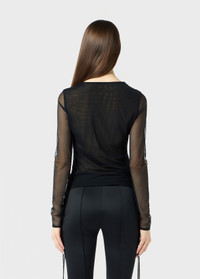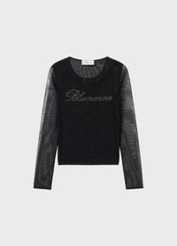 Stretch tulle top with blumarine logo embroidered in rhinestones, coupled bodice, and see-through long sleeves. - Stretch stretch - Embroidery glass rhinestone blumarine logo detailing - Round neckline - Coupled top - Long see-through sleeves - Regular fit - Made in Italy DETAILS To find the correct size for you, please consult the Size Guide. Composition: Main fabric: 82% polyamide, 18% elastane; Main lining: 82% polyamide, 18% elastane; Embroidery: 100% glass Wash delicate cycle max 30°C; Do not bleach; Do not tumble dry; Iron at low temperature - no steam; Do not dry clean; Wash separately; Wash inside out; Iron inside out