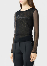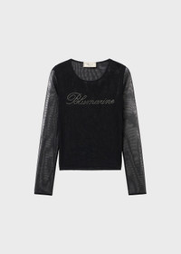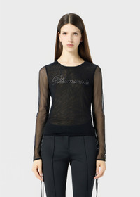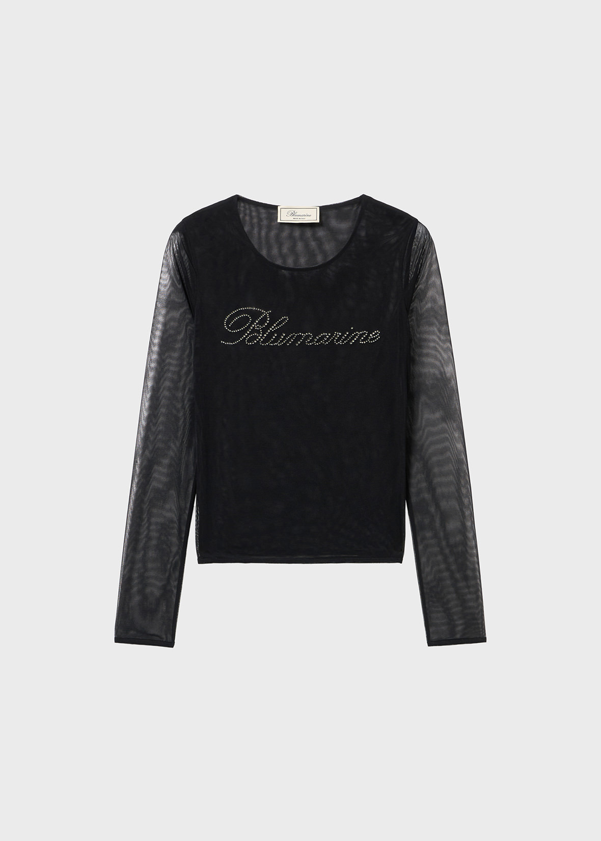 STRETCH TULLE TOP WITH BLUMARINE LOGO EMBROIDERED IN RHINESTONES, COUPLED BODICE, AND SEE-THROUGH LONG SLEEVES. COMPOSITION: 82%PA 18%EA - STRETCH STRETCH - EMBROIDERY GLASS RHINESTONE BLUMARINE LOGO DETAILING - ROUND NECKLINE - COUPLED TOP - LONG SEE-THROUGH SLEEVES - REGULAR FIT DETAILS COLORS: BLACK