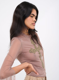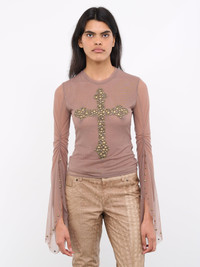 BLUMARINE t-shirt in brown, studded cross detailing, tulle construction, semi-sheer, crewneck, long sleeves, slit flared cuffs, rounded hem, slim fit. Italian Sizing 82% Nylon, 18% Elastane Model is 5'10" wearing size 40. Bust: 32" Waist: 25" Hips: 35"