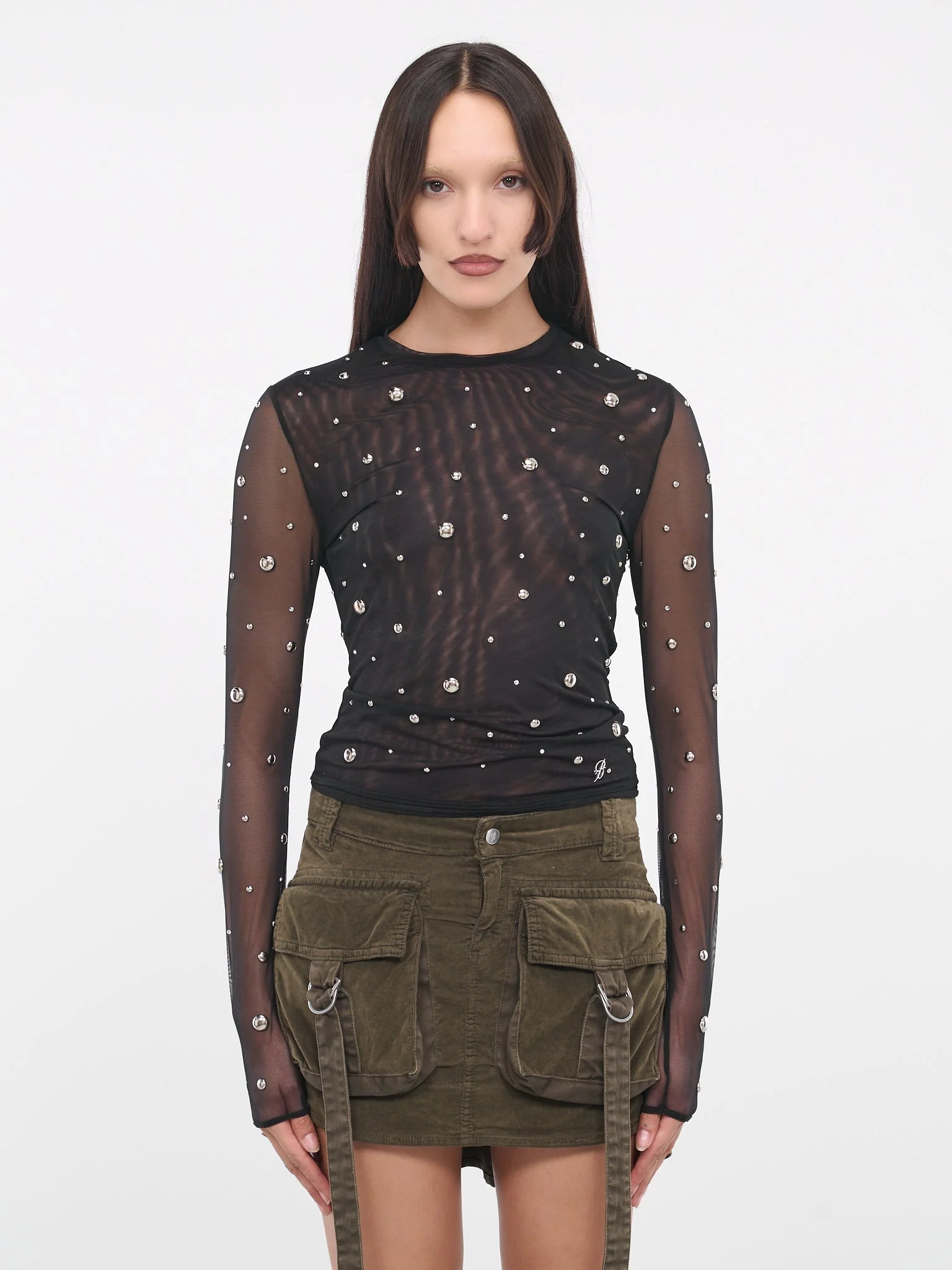 BLUMARINE black top, stretch tulle, stud & rhinestone embellished, round neckline, long sleeves, slim fit. Made in Italy 82% Nylon, 18% Elastane Italian Sizing Model is 5'8" wearing size 38. Bust: 32" Waist: 26" Hips: 34.5"