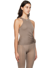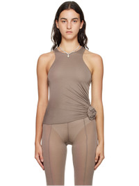 Semi-sheer plain woven viscose tank top. · Crewneck · Ruching and graphic applique at side · Asymmetric hem Supplier color: Coffee liqueur 100% viscose. Made in Italy 231901F111025