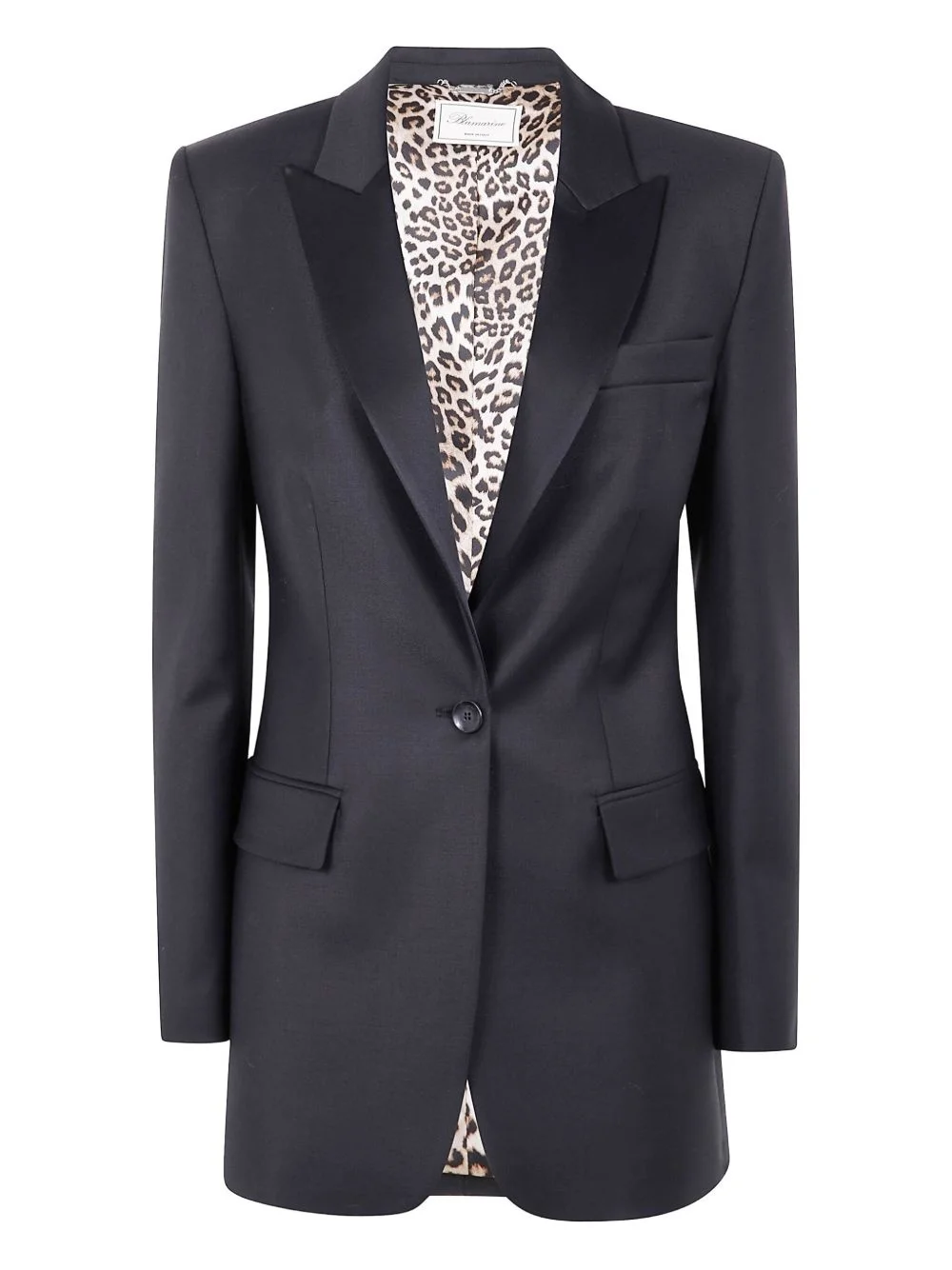 satin single-breasted blazer Highlights - Black - Front button fastening - Leopard print lining - Long sleeves - Flap pockets Imported Composition Polyester 100% Washing instructions Read Manufacturer Guidelines