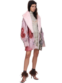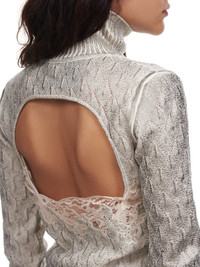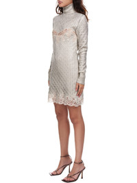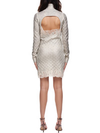 Blumarine dress in cream, ribbed turtleneck collar, long sleeves with ribbed hem detailing, front mesh lace detailing, shimmer knit fabric with jacquard patterning, open back, attached slip, mesh lace hem. Made In Italy. Standard S-L Sizing. Composition - (Main) 100% Wool, (Secondary) 83% Polyamide, 17% Acetate. Model Measurements: Model is 5ft 8” and wearing a size S. Bust: 34” Waist: 24” Hip: 33"