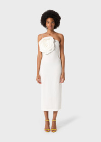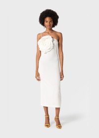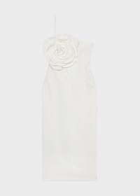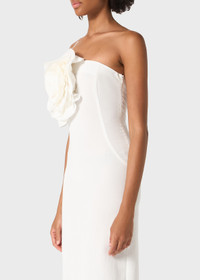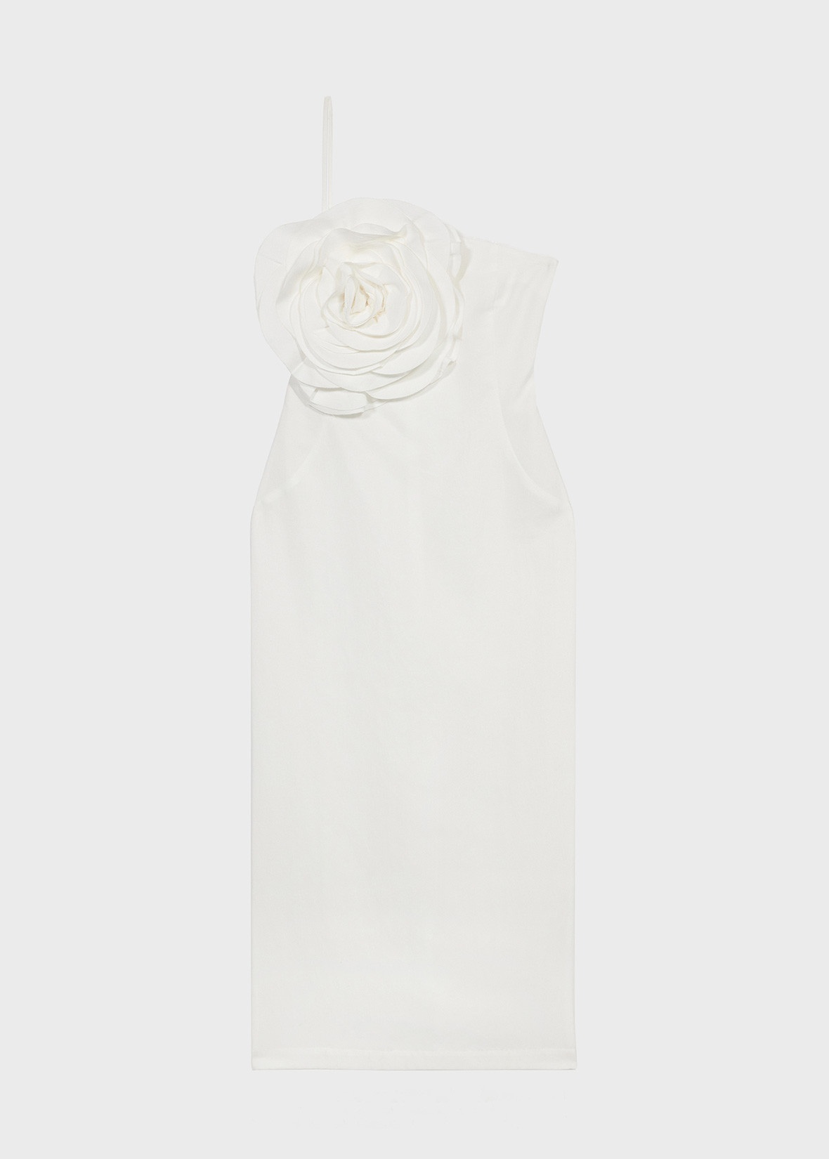 SHEATH DRESS IN FLUID WASHED GABARDINE, EMBELLISHED WITH A HANDCRAFTED MACRO ROSE AND A BACK SLIT. COMPOSITION: 93% VISCOSE 7% POLYAMIDE - FLUID GABARDINE - SHEATH LINE - ONE-SHOULDER STYLE - HAND-MADE MACRO ROSE DECORATION - BACK VENT - ZIP CLOSURE AT SIDE - MIDI-LENGTH - REGULAR FIT DETAILS COLORS: WHITE