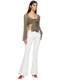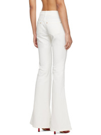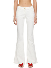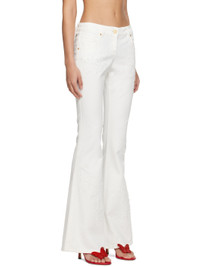 Stretch left-hand twill denim jeans. Embroidered graphic and subtle distressing throughout. · Belt loops · Five-pocket styling · Zip-fly · Flared cuffs · Embroidered logo patch at back waistband Supplier color: Bianco 98% cotton, 2% elastane. Made in Albania 231901F069002