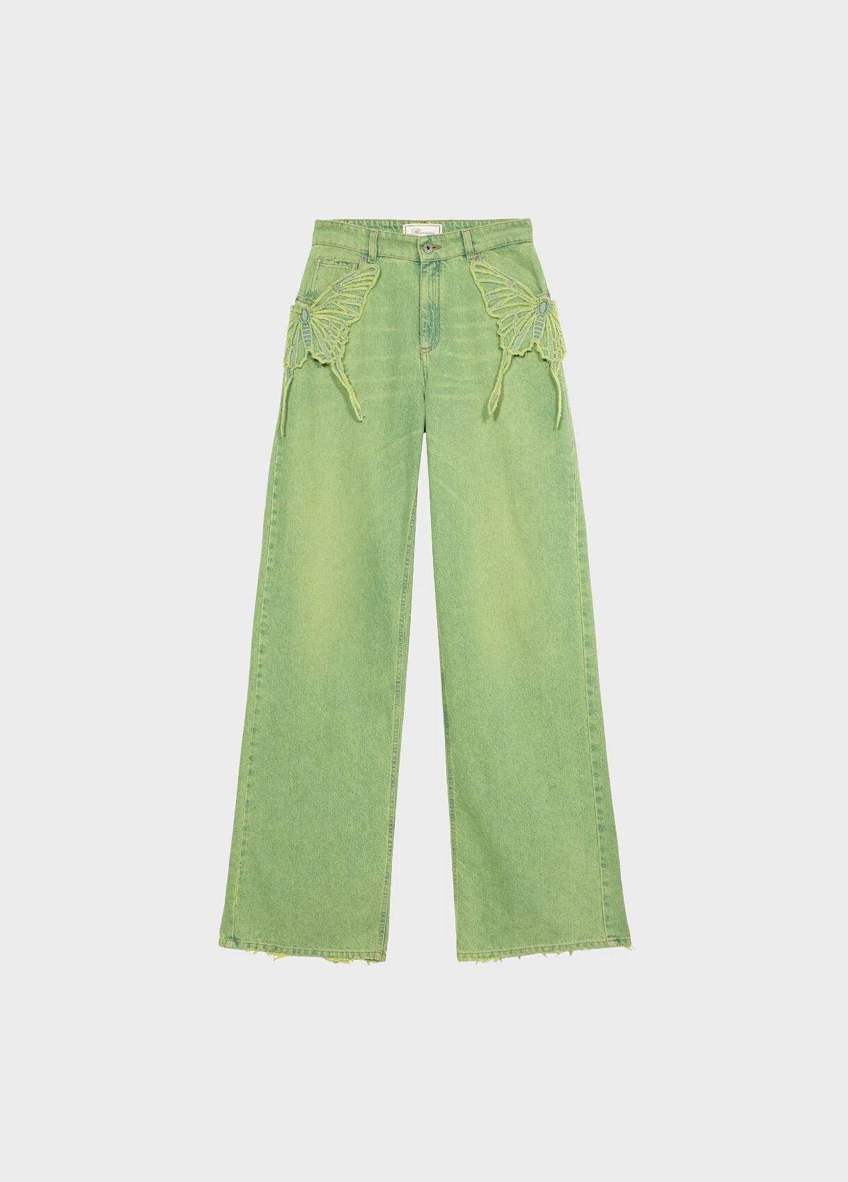 Five-pocket wide leg jeans in medium wash denim with butterfly embroidery on the sides. - Medium wash denim - Butterfly embroidery on the sides - Five-pocket style - Belt loops - Button and zip closure - Puddle hem - Monogram B label on the back - Regular fit DETAILS To find the correct size for you, please consult the Size Guide. Composition: Main fabric: 100% Cotton | Pocket lining: 65% Polyester, 35% Cotton | Application: 99% Cotton, 1% Polyester Hand wash - room temperature; Do not bleach; Do not tumble dry; Iron at low temperature - without steam; Do not dry clean; Wash separately; Do not expose to direct heat sources; Wash inside out; Iron inside out