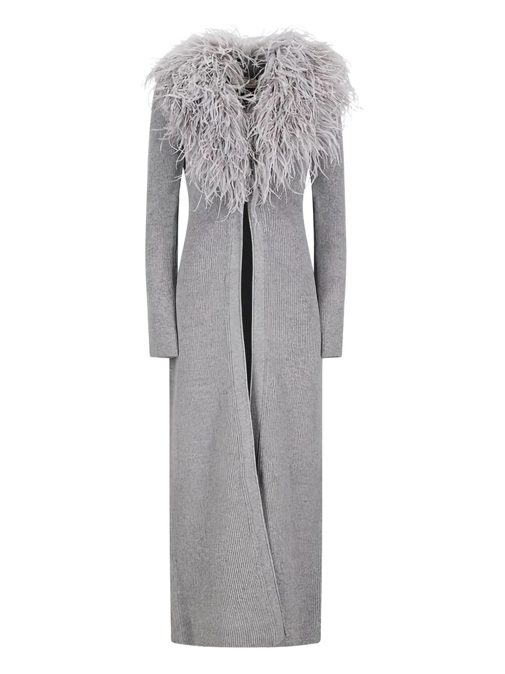wool cardi-coat Highlights - Grey - Feather trim - Ribbed knit - Long sleeves - Open front - Long length Imported Composition Wool 100%, Feather 100% Washing instructions Read Manufacturer Guidelines
