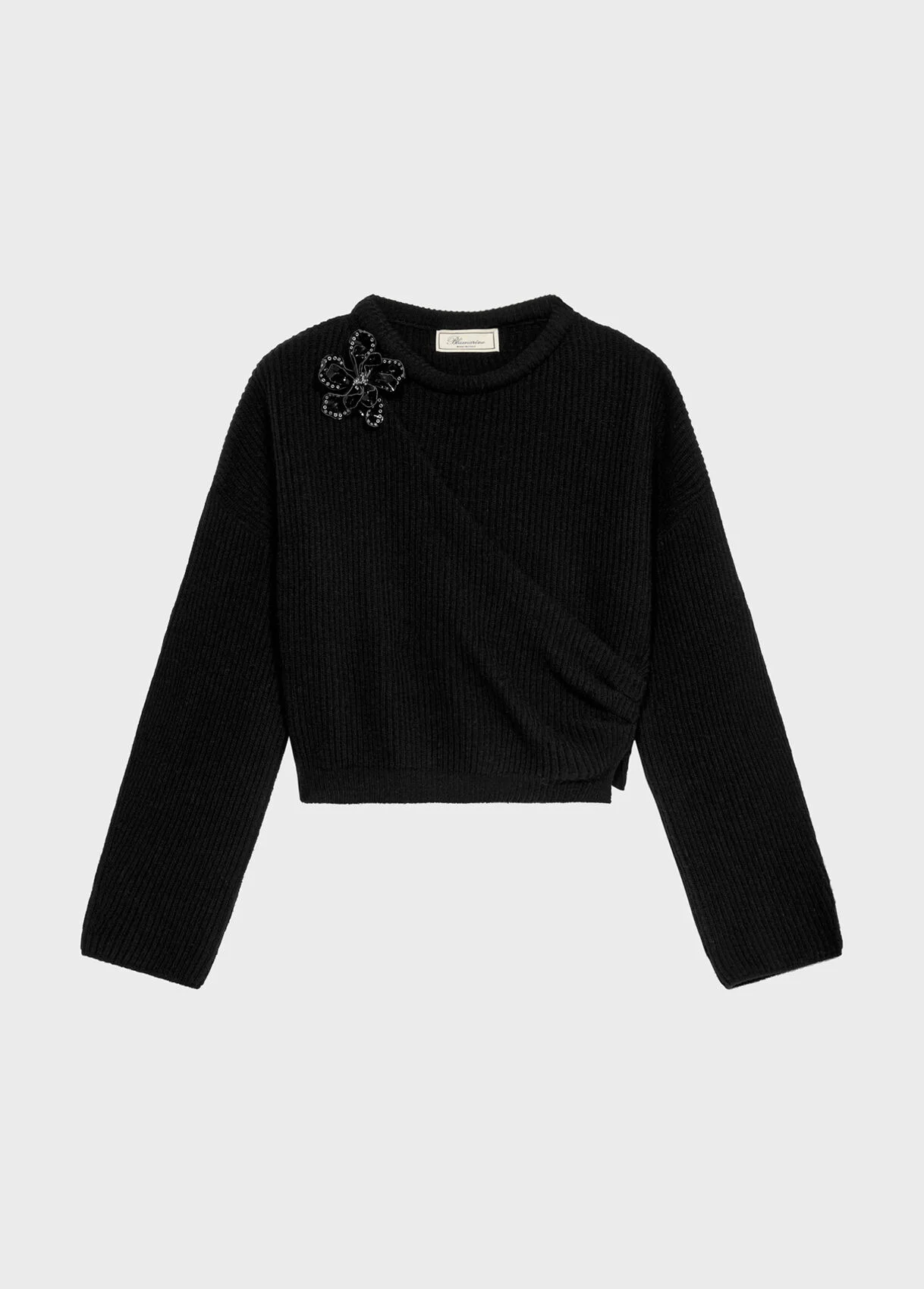 a varnished flower decorated with metal eyelets for the wool rib knit with draping on one side. - Wool rib knit - Varnished flower decorated with metal eyelets - Round neckline - Gathering on one side - Split on one side - Long sleeves - Regular fit - Made in Italy DETAILS To find the correct size for you, please consult the Size Guide. Composition: Yarn 1: 100% virgin wool; Accessory: 100% polyurethane Hand wash - room temperature; Do not bleach; Do not tumble dry; Iron at low temperature - no steam; Dry clean with tetrachloroethylene or hydrocarbons - gentle cycle; Dry flat; Remove detachable accessories before washing; Wash inside out