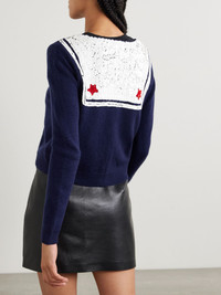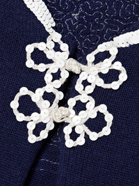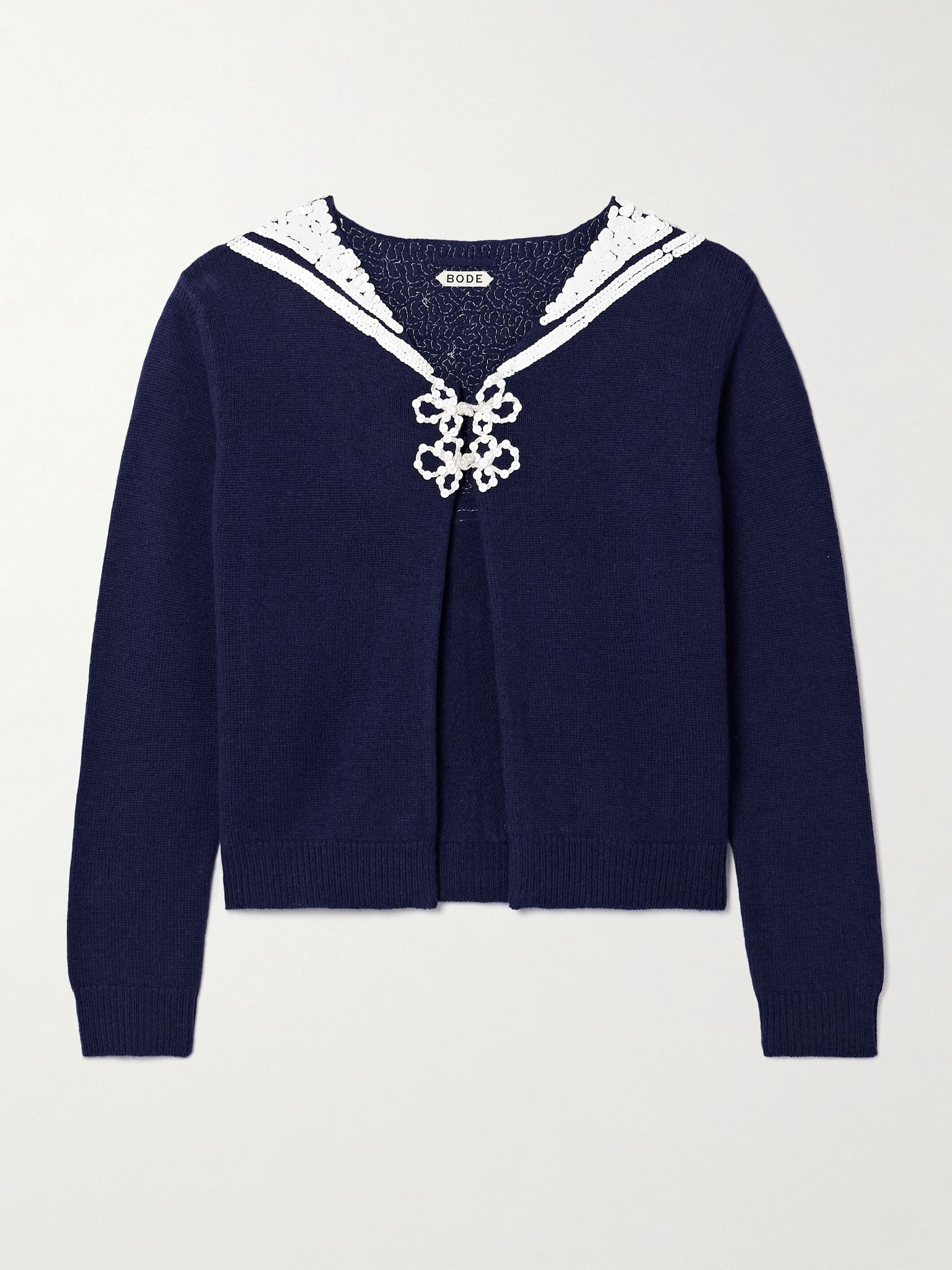 BODE's 'Astoria' cardigan is decorated with sequins that have been carefully hand-arranged to emulate the look of traditional sailor uniforms. It's knitted from a soft, lightweight wool and cashmere-blend and fastens with two knotted buttons. Size & Fit - Fits true to size, take your normal size - Designed for a slightly loose fit - Lightweight knit - Model is 180cm/ 5'11" and is wearing a size XSmall Details & Care - Navy wool and cashmere-blend - Button fastenings through front - 90% wool, 10% cashmere - Dry clean