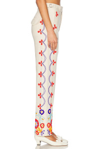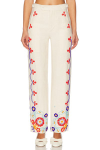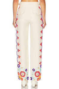 Details - Self: 100% linen - Lining: 100% cotton - Made in India - Dry clean only - Zip fly with hook and bar and button closures - Side slant pockets - Back flap pockets - Beaded floral detail - Linen fabric - Our Style No. BOFE-WP31 - Manufacturer Style No. MRS25BT035