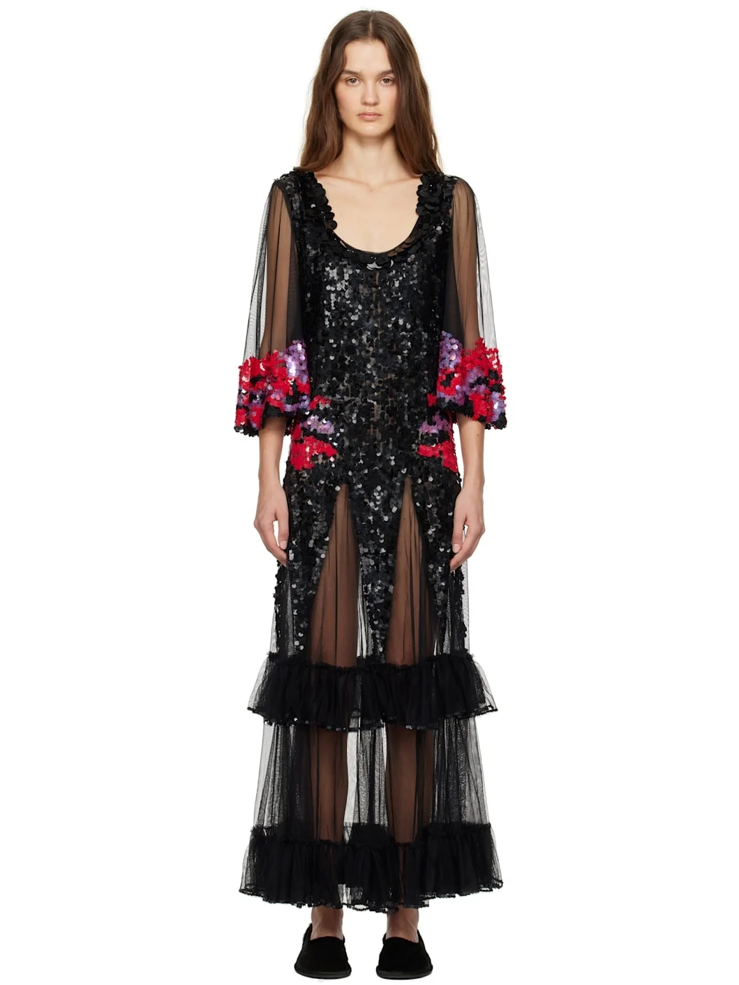 Semi-sheer nylon tulle maxi dress. Hand-applied sequins throughout. · Tired construction · Scoop neck This item is part of a limited run of 11. Supplier color: Black multi Body: 100% nylon. Trim: 100% polyester. Made in India 251169F055000