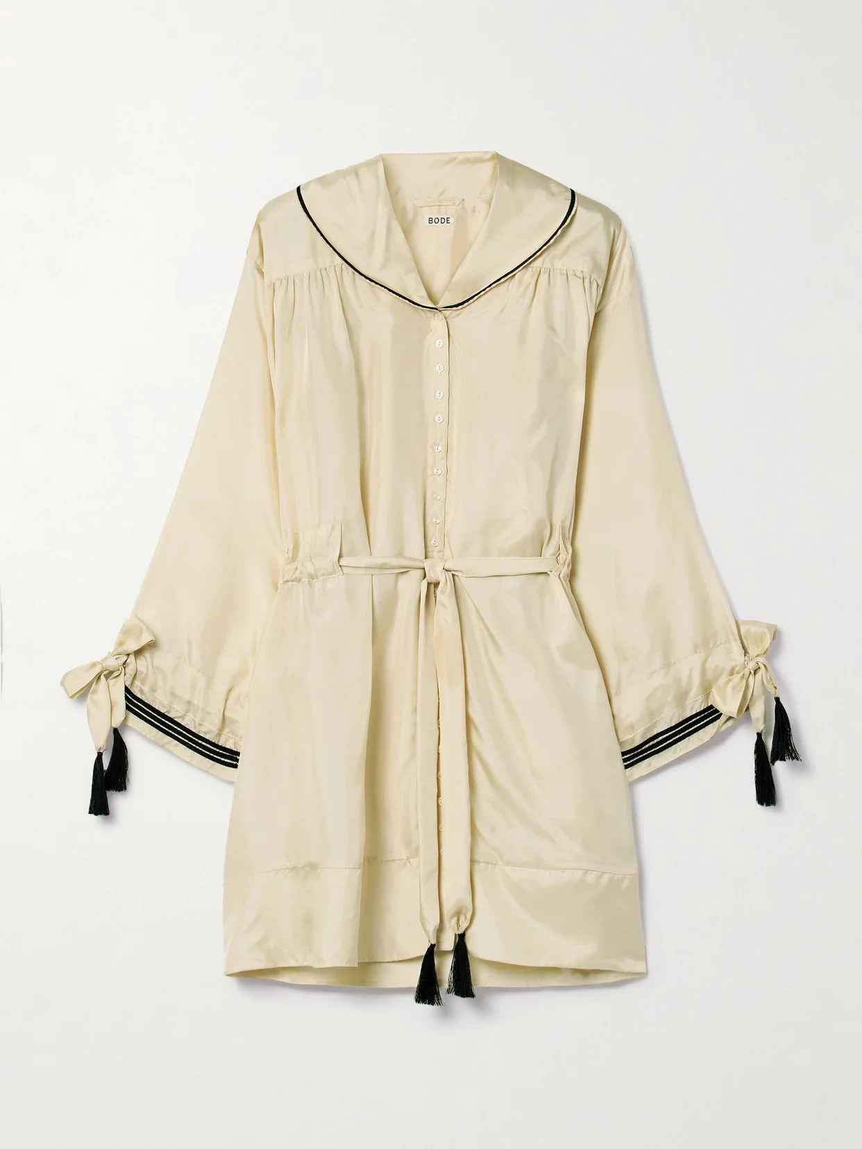 BODE's 'Boater' mini dress is imbued with a vintage charm that tells such a beautiful story. Inspired by a 1920's blouse, it's cut from airy silk-satin and has nautical-inspired details like the navy trims tracing the sailor collar and back vent. Use the tasseled belt to cinch the shape.