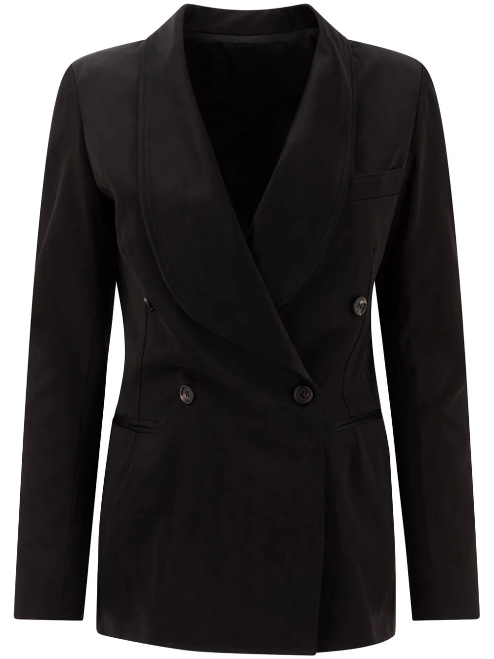 Sheen suit jacket Highlights - Black - Double-breasted button fastening - Buttoned cuffs - American rear vent - Two side welt pockets Imported Composition Viscose 54%, Cotton 46%