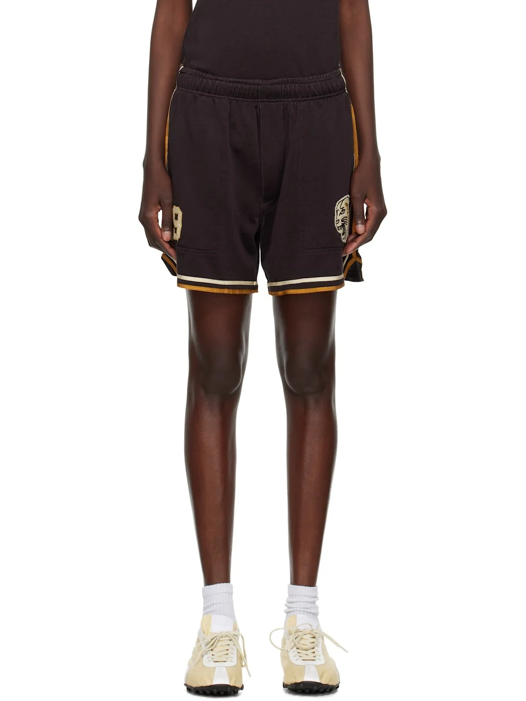 Rayon- and cotton-blend jersey shorts. · Concealed drawstring at elasticized waistband · Three-pocket styling · Graphic and text appliques at front · Stripes at outseams, back, and cuffs This item is part of a limited run of 80. Supplier color: Brown/Black 53% rayon, 47% cotton. Made in Portugal 251169F088007