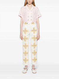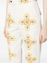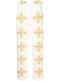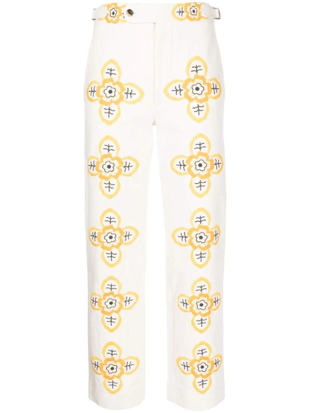 Buttercup embroidered straight-leg trousers Vintage-inspired motifs take centre stage in BODE's Buttercup trousers. Made from cotton, they boast a sleek, straight-leg silhouette adorned with a geometric flower pattern, drawing inspiration from a 1930s-1940s embroidered tablecloth. Highlights - White/mustard yellow - Cotton - Floral embroidery - Mid-rise - Belted waist tabs - Concealed fly and button fastening - Two side slash pockets - Two rear flap pockets - Straight leg Imported Composition Lining: Cotton 100% Outer: Cotton 100% SIZE & FIT Model measurements Height 5 ft 10 in(1.78 m) Bust/Chest 29.13 in(74 cm) Hips 35.43 in(90 cm) Waist 23.62 in(60 cm) FittingInformation Designed for a straight-leg fit, these trousers allow for a close fit at the waist and an unrestricted, comfortable fit over the leg Made from a midweight non-stretch fabric This piece fits true to size – take your usual size Washing instructions Dry Clean Only
