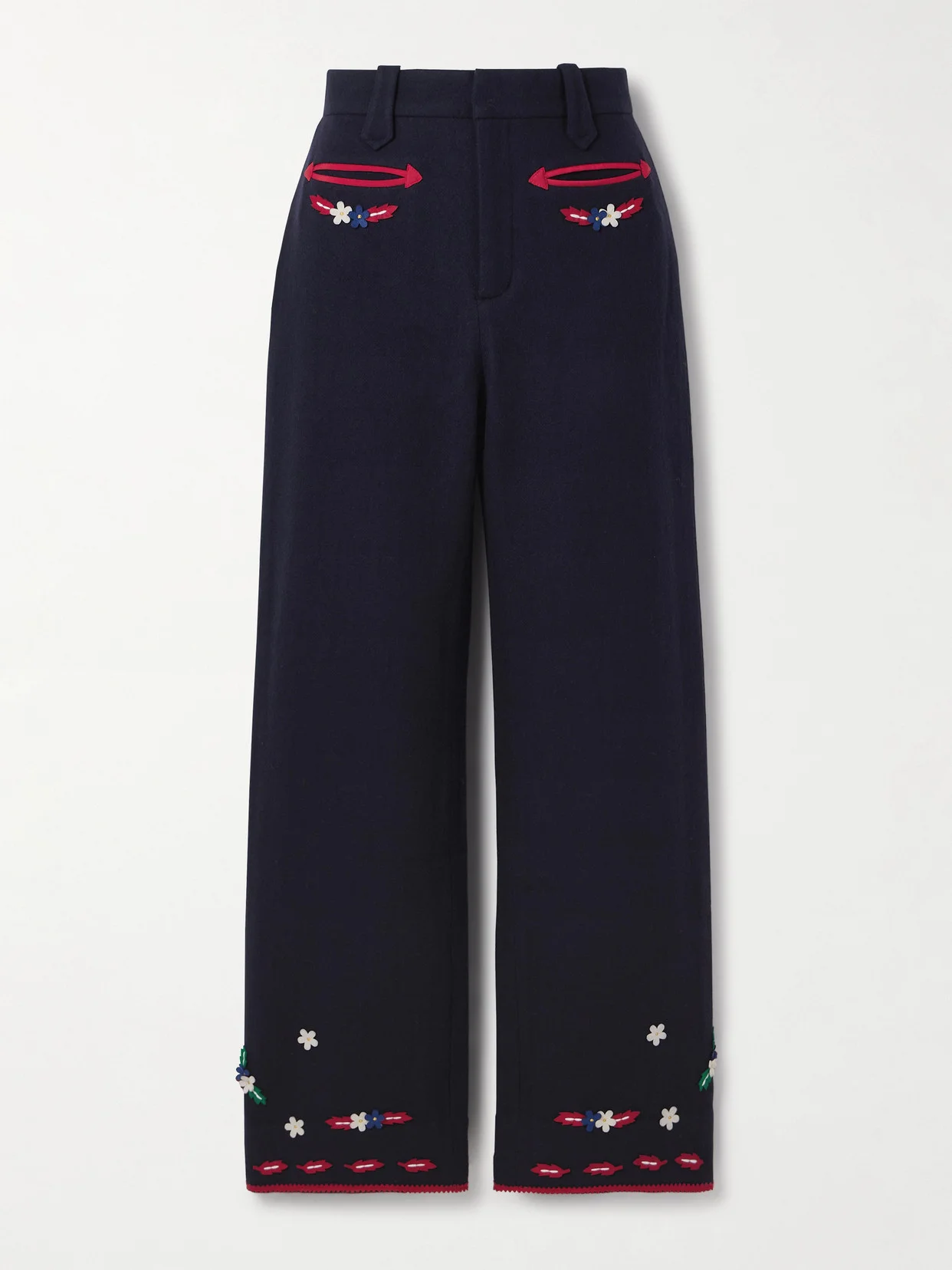 BODE's straight-leg 'Carroll' pants are part of a set with the coordinating jacket. They're tailored from wool felt in a straight-leg shape and appliqued with colorful floral motifs.