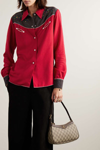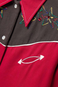 EDITORS'NOTES BODE's shirt is a faithful reproduction of a Western-inspired style from the 1950s, right down to the 'smile' pockets and white piping. It's made from red cotton-blend twill paneled with cotton-blend canvas and has a slightly loose fit. Style yours with relaxed tailoring. SIZE & FIT - Fits true to size, take your normal size - Intended for a slightly loose fit - Mid-weight, non-stretchy fabric - Model is 180cm/ 5’11” and is wearing a US 2 DETAILS & CARE - Red cotton-blend twill, anthracite cotton-blend canvas - Snap fastenings through front - 50% cotton, 50% viscose