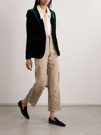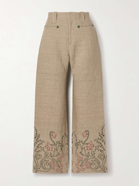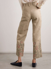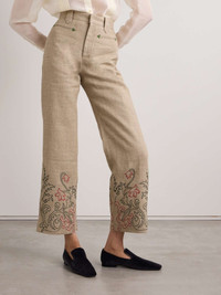 EDITORS'NOTES BODE's pants are inspired by a vintage Victorian-era bag - the floral embroidery is almost identical to the one seen on the original design. They're woven from structured linen and have wide legs. Complement the high waist with a tucked-in blouse or T-shirt. SIZE & FIT Model measurements: - Fits true to size, take your normal size - High-rise, cut for a straight-leg fit - Lightweight, non-stretchy fabric - Model is 183cm/ 6'0" and is wearing a size 26 - Bust: 79cm/ 31" - Waist: 61cm/ 24" - Hip: 85cm/ 35.5" DETAILS & CARE - Sand linen - Concealed hook and zip fastening at front - 100% linen; lining: 100% cotton - Dry clean