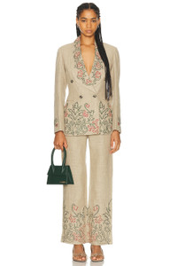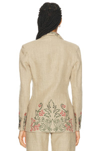 Details - Self: 100% linen - Lining: 100% cotton - Made in India - Dry clean only - Dual front button closure - Padded cuffs - Side welt pockets - Button cuffs - Linen fabric with embroidered graphics - Our Style No. BOFE-WO13 - Manufacturer Style No. WRS24SJ002