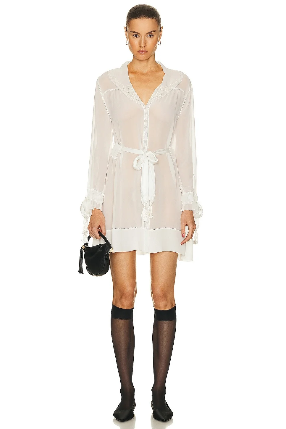 Details - 100% cotton - Made in India - Dry clean only - Unlined - Front snap button closure - Removable waist tie - Tie detail at cuffs with tassel detail - Garment is made with a semi-sheer fabric, undergarments can show through - Our Style No. BOFE-WD2 - Manufacturer Style No. WRF23DR006