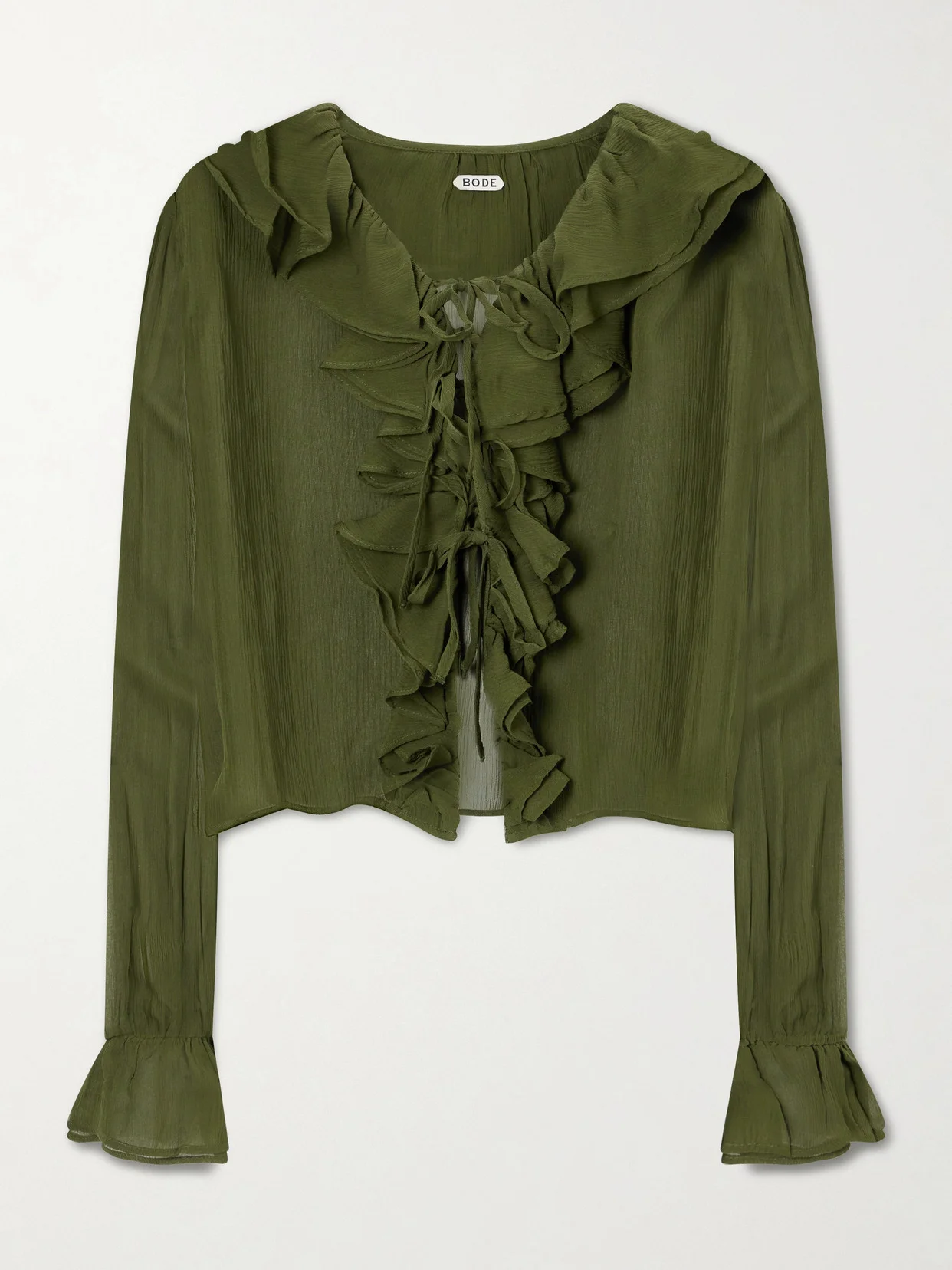 Traditional French styles from the 20th century inspire BODE's 'Flounce' blouse. Made from silk-crepon, it's traced with fluttery ruffles along the open, tie-detailed front and has flared cuffs. Underpin yours with a bralette to temper the sheerness.