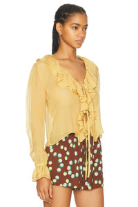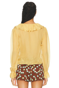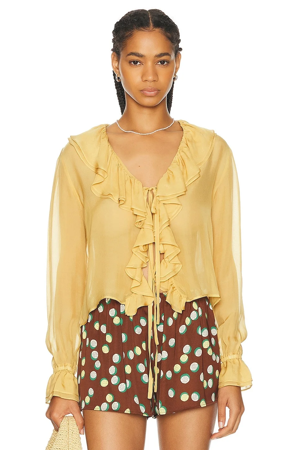 Details - 100% silk - Made in Portugal - Dry clean only - Front tie closure - Puff sleeves with elastic cuffs - Chiffon fabric with ruffle neckline - Our Style No. BOFE-WS63 - Manufacturer Style No. WRS24SH039-PG00138