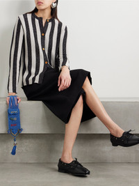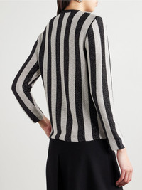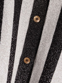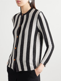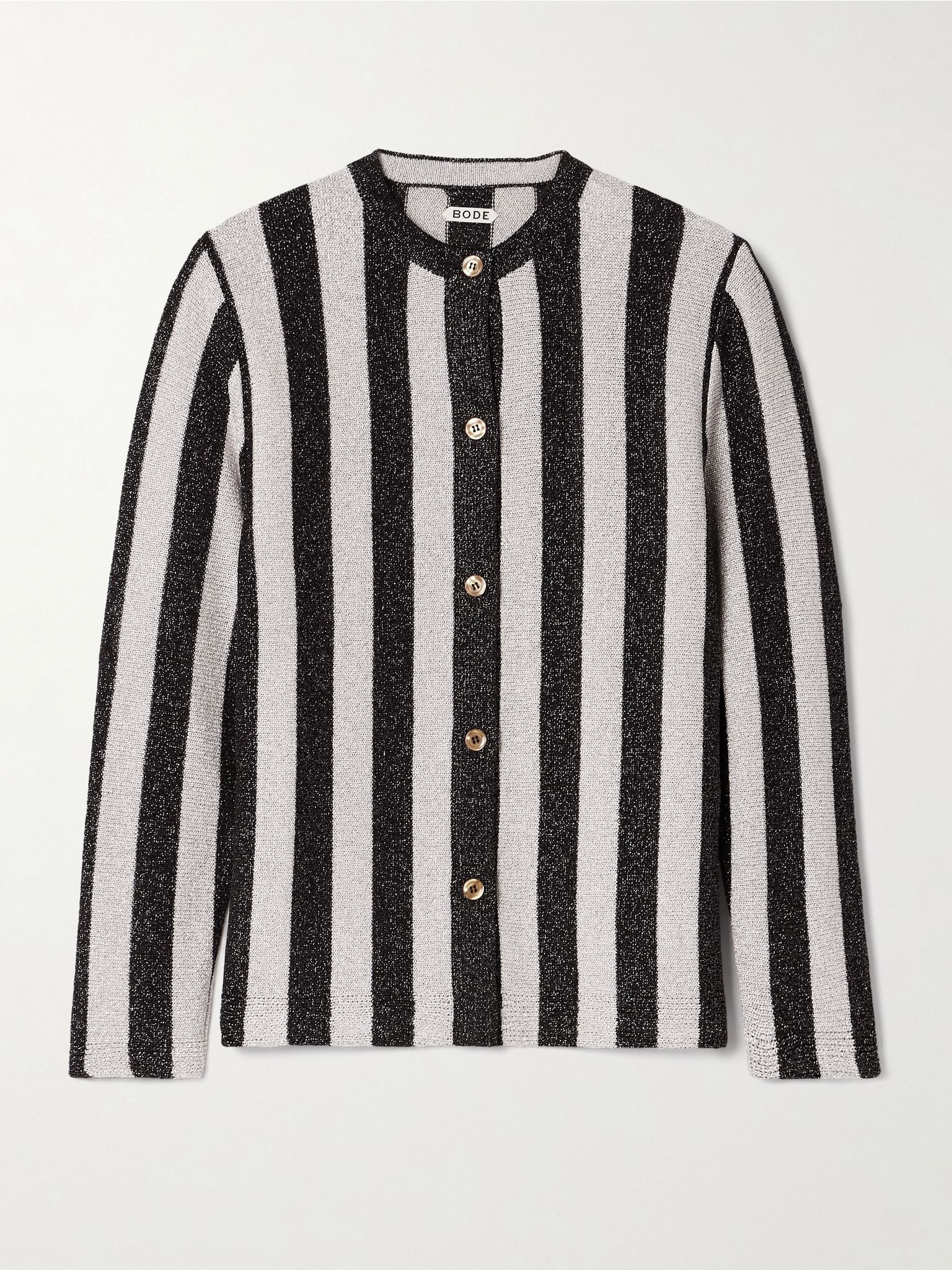 BODE's vintage-inspired collections are rooted in "a sentimentality for the past". This 'Grandstand' cardigan is patterned with metallic stripes and fastens with lustrous buttons. Size & Fit - Fits true to size, take your normal size - Designed for a for a slightly loose fit - Lightweight, stretchy fabric - Model is 180cm/ 5’11” and is wearing a size XSmall Model measurements: - Bust: 79cm/ 31" - Waist: 61cm/ 24" - Hip: 89cm/ 35" Details & Care - Black and silver viscose and metallic fiber-blend - Button fastenings through front - 80% viscose, 20% metallic fibers - Dry clean